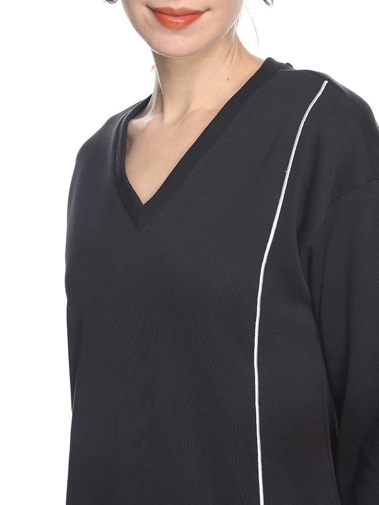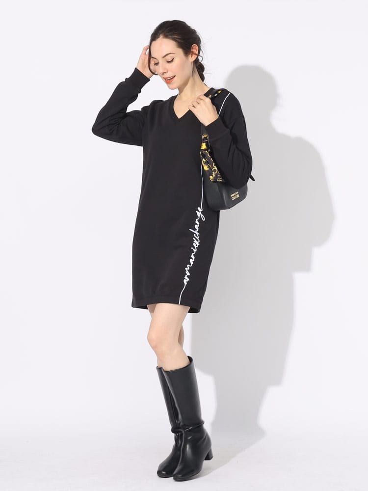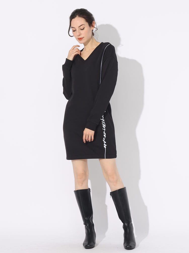 カジュアルな印象になってしまうスウェットワンピースですが、首元がすっきりと見えるVネックですのでカジュアル過ぎないオトナでも着やすい一着です。