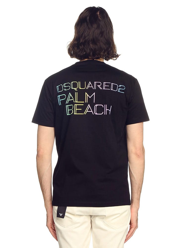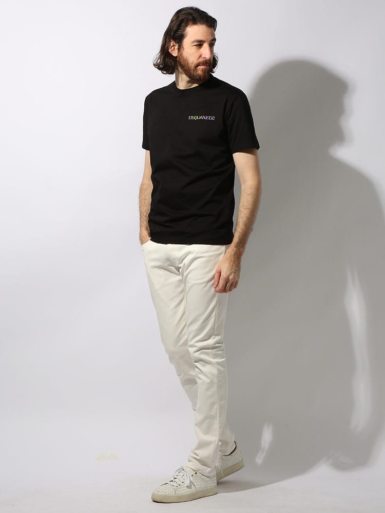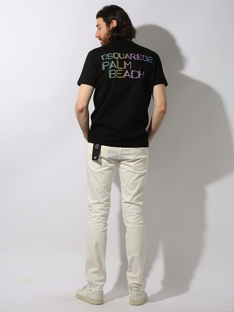 DSQUARED2の半袖プリントTシャツは、目を引くネオンカラーのロゴプリントが特徴。フロントはシンプルながらも、背面に大胆なバックプリントが施されており、遊び心とブランドのアイデンティティを表現しています。このTシャツは、カジュアルながらも派手なスタイルを好む人に最適で、様々なカジュアルコーディネートのアクセントとして活躍します。