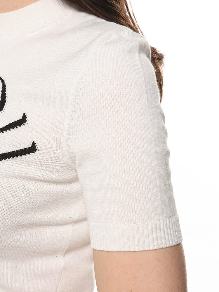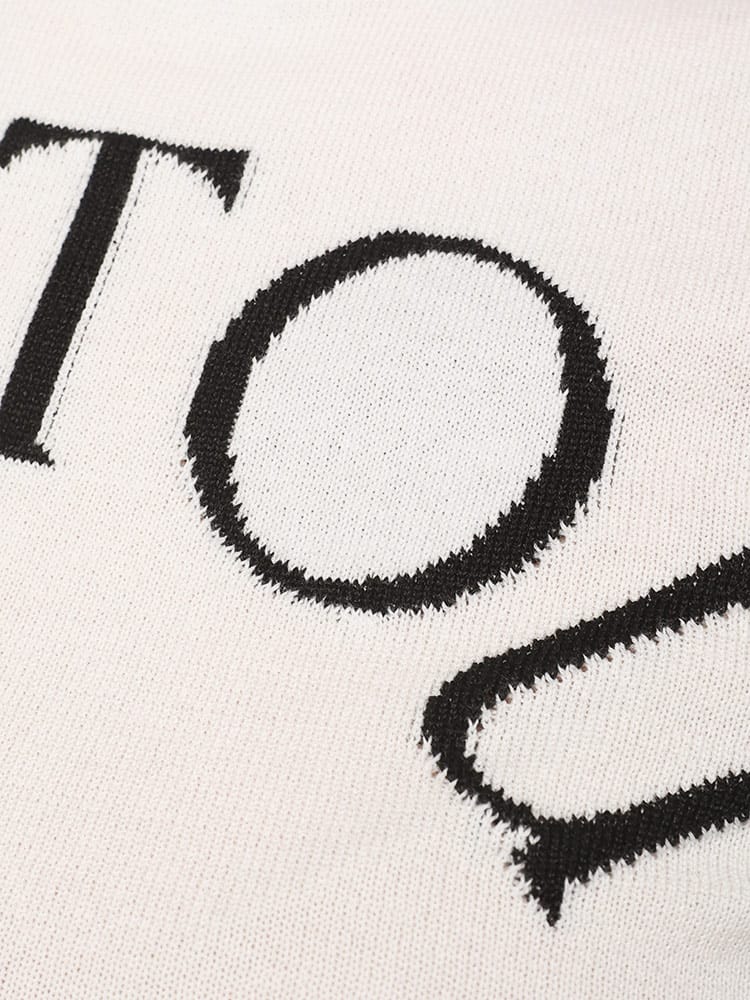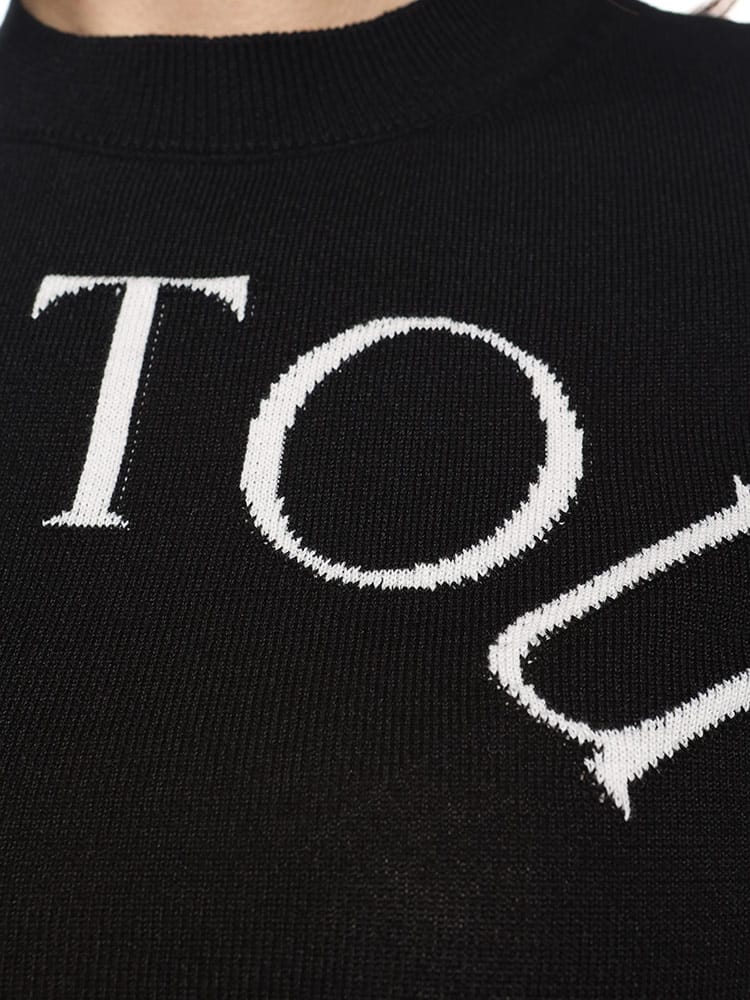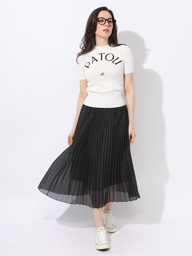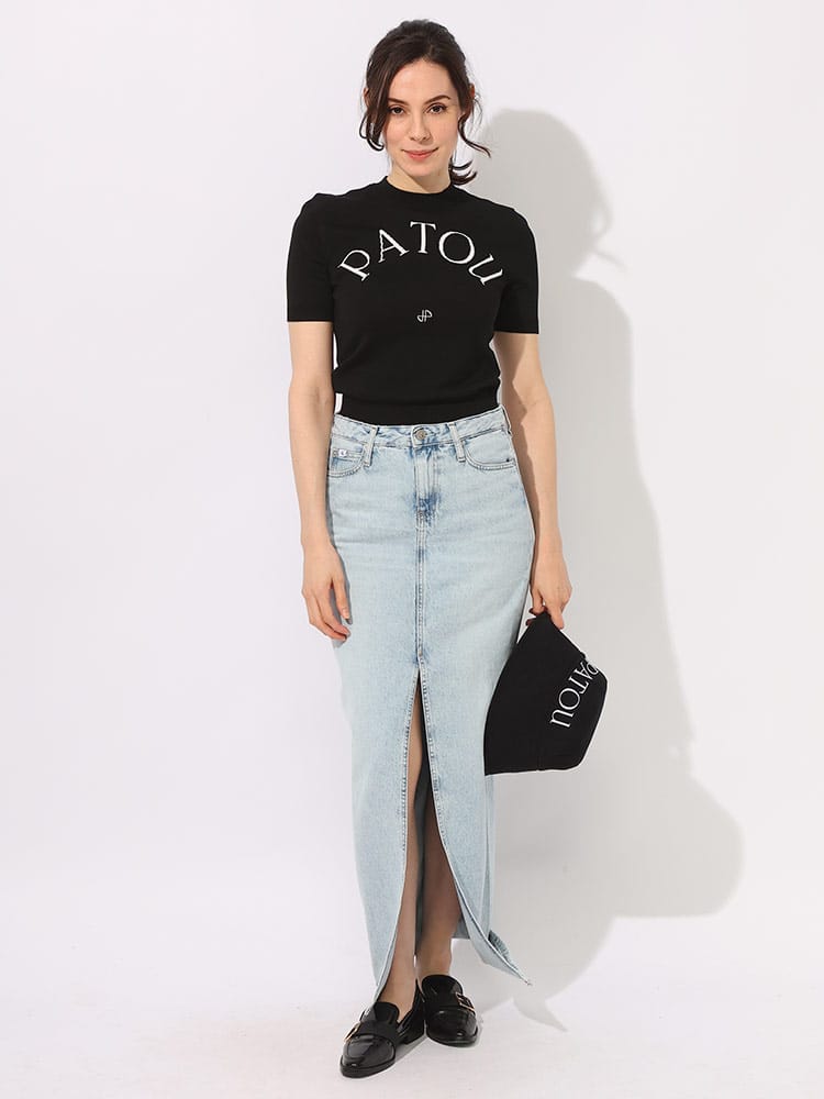 “Patou”の5文字が隠された新しいスタイルの仲間たち。ブラックのオーガニックコットン製ニットトップ。ぴったりとフィットするスタイル、ショートスリーブ。ラウンドネックライン。カラー、袖口、ウエストにリブ入り。フロントにホワイトのパトゥ レタリングロゴとモノグラムジャカード。