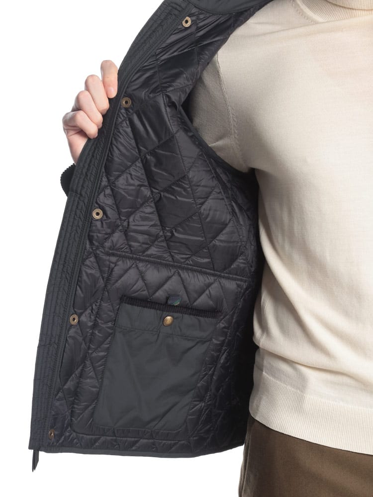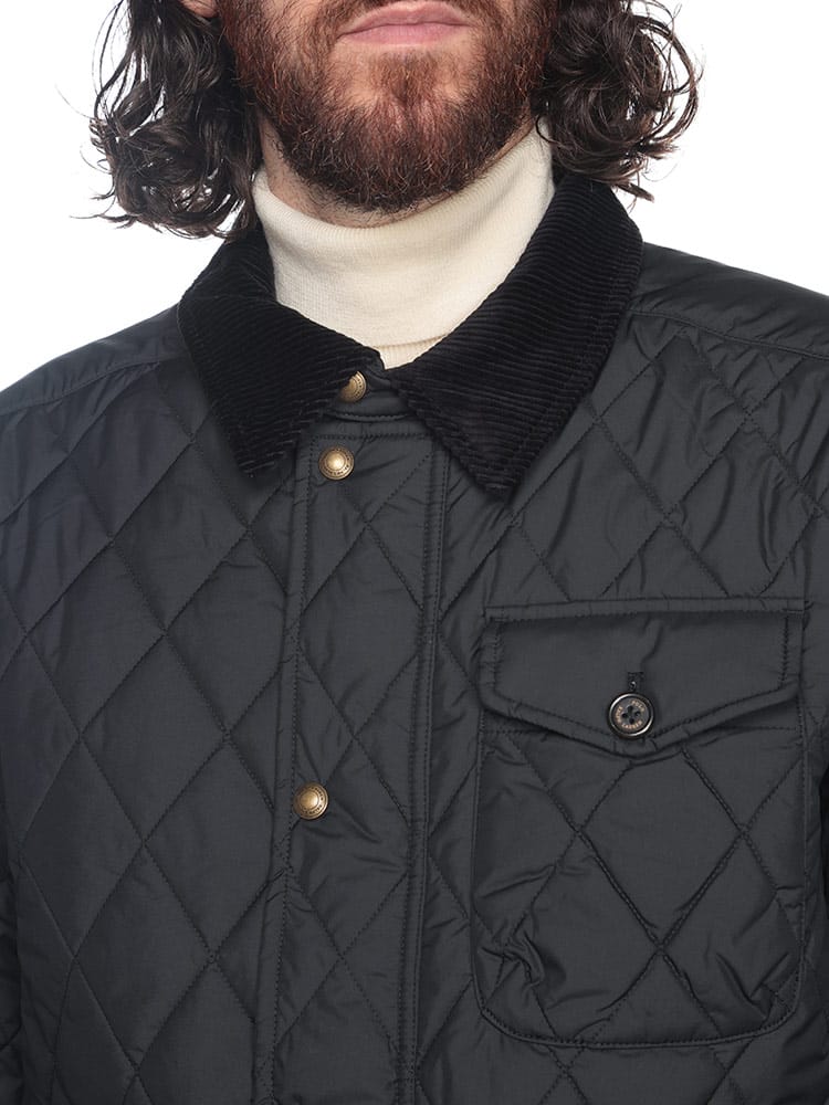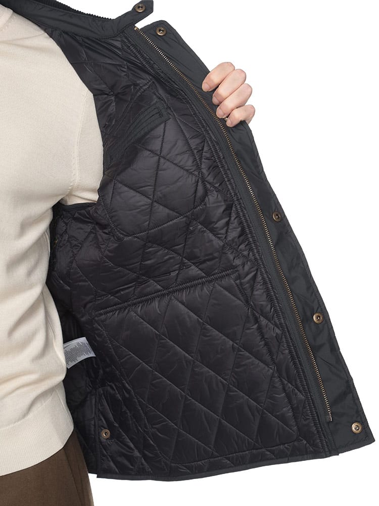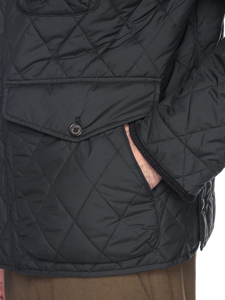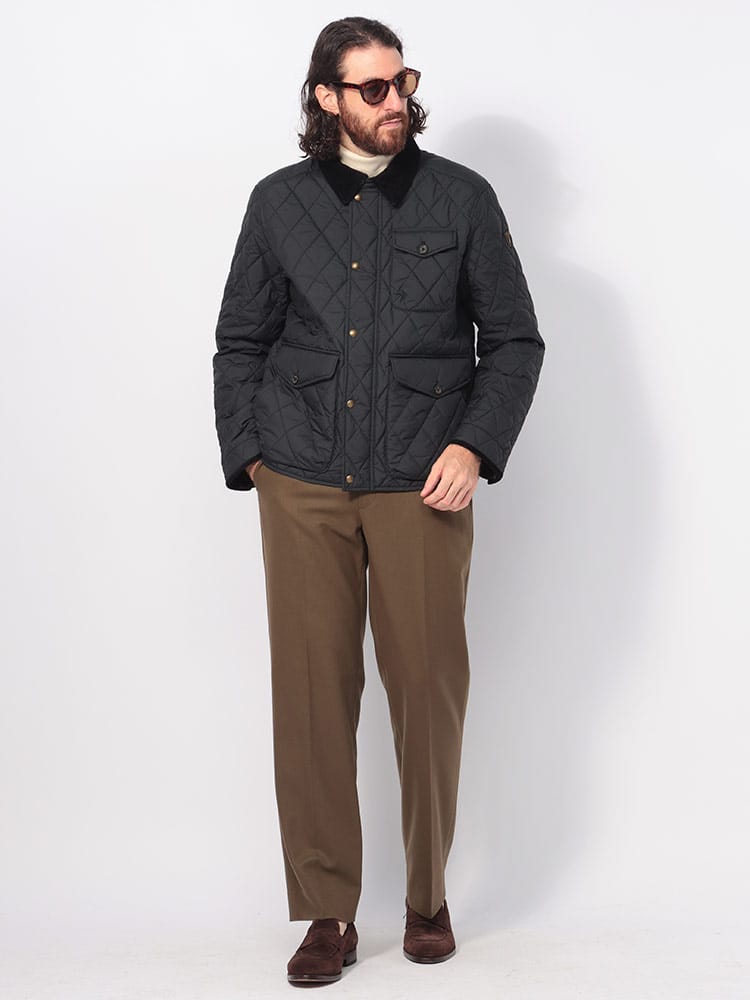 撥水フルジップキルテッドジャケットは、機能性とスタイルを兼ね備えた一着です。撥水加工により、悪天候でも快適に過ごせます。襟切替デザインがアクセントとなり、クラシックで上品な印象を与えます。