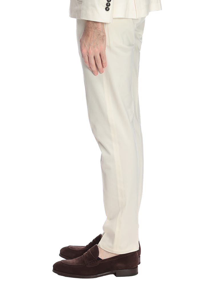 快適な穿き心地と美しいシルエットを両立した、チルコロ1901の定番アイテムです。上質なストレッチコットン素材を使用し、伸縮性がありながらも型崩れしにくいのが特徴。ノータックのデザインは、すっきりとしたシルエットで、スタイリッシュな着こなしを演出します。カジュアルなスタイルにはもちろん、ジャケットと合わせたきれいめなスタイルにもマッチする、汎用性の高いアイテムです。