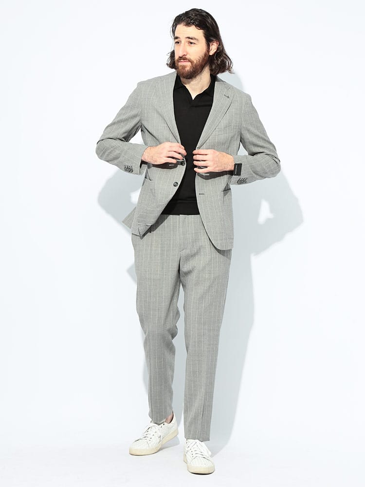 仕様 :ジャケット外側ポケット数×3つ / 内側ポケット数×2つ / シングル2つボタン / サイドベンツ / スラックスポケット×4つ / ジップフライ / ワンタック / ウエストゴム