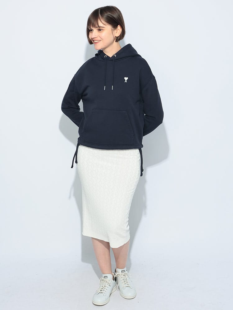 AMI PARISのアイコニックなプルオーバーパーカー。胸元のAMI DE COEUR刺繍がブランドらしさを演出します。トレンドのショート丈に裾のドローコードで、様々なボトムスとの着こなしが楽しめるデザイン。上質なコットン裏毛素材で着心地も快適。大人の抜け感を叶えるアイテムです。