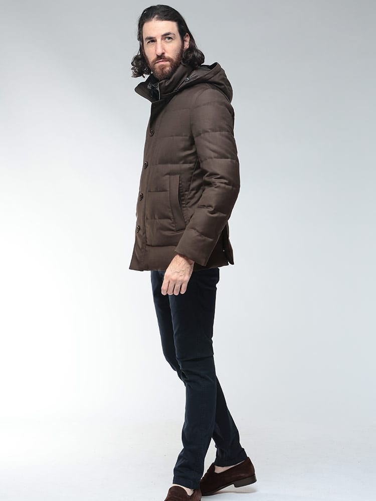 フーデッドダウンジャケット。上質な素材と立体的なパターンにより、すっきりとしたシルエットを実現。軽量ながらも高い保温性を誇り、寒い季節でも快適に過ごせます。シンプルなデザインに機能美が宿る一着で、カジュアルからビジネスシーンまで幅広く活躍。洗練された大人のためのダウンジャケットです。