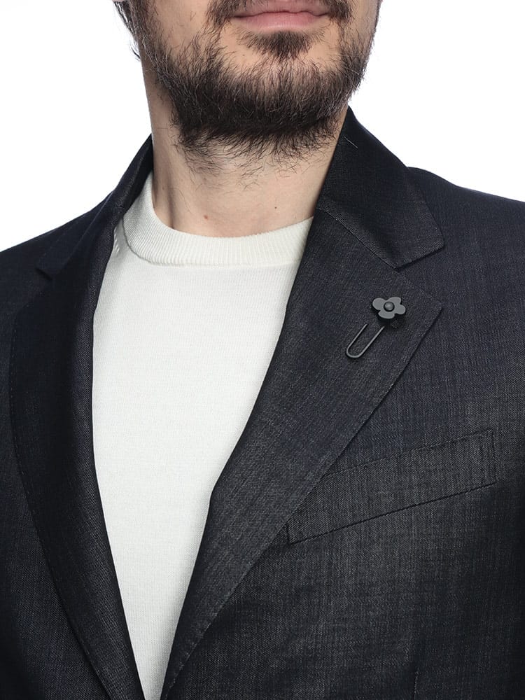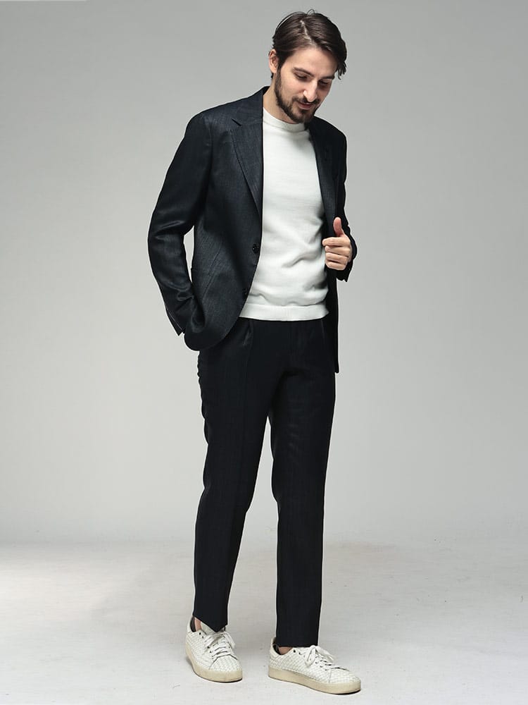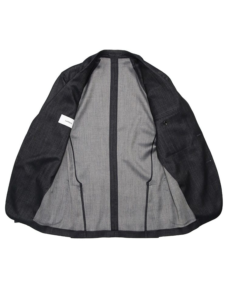イタリアの名門LARDINI(ラルディーニ)から、デニムのような風合いを上品に昇華させた、ウール・キュプラ混紡のデニムルックセットアップが登場。ウールの品格とキュプラのしなやかさが生み出す絶妙な光沢感により、カジュアルな佇まいの中にサルトリアならではの高級感が漂います。ジャケットは軽やかな袖裏のみの仕立てにサイドベンツを採用し、ワンタックのスラックスがクラシックかつモダンなシルエットを構築。ブランドの象徴であるブートニエールが映える洗練されたデザインは、タイドアップしたビジネススタイルから、Tシャツで崩したビジカジまで幅広く対応します。伝統的な仕立てと現代的な素材使いが融合した、大人の日常を贅沢に彩る至高のスーツです。