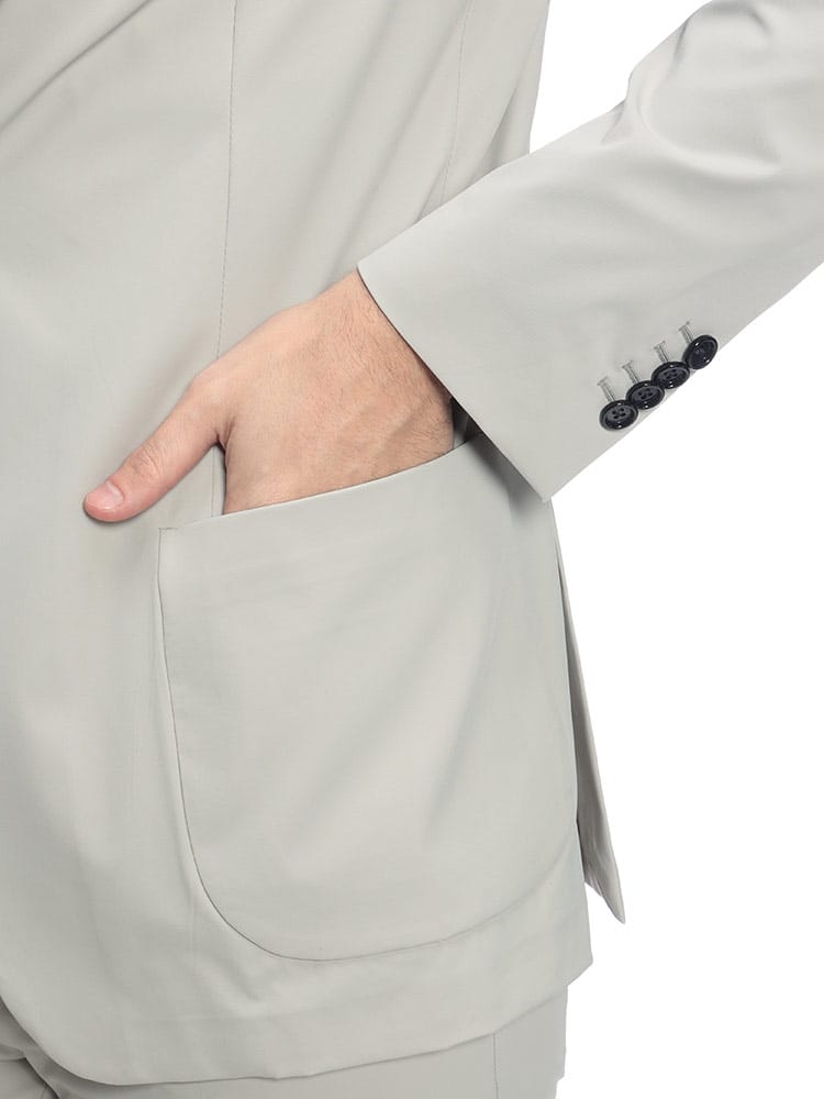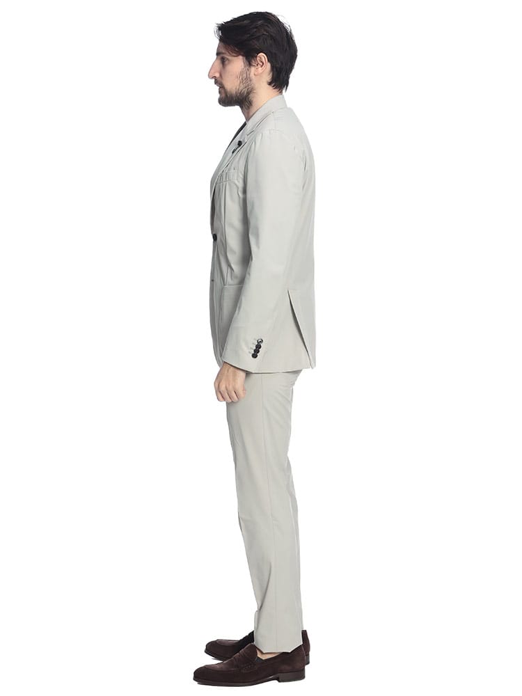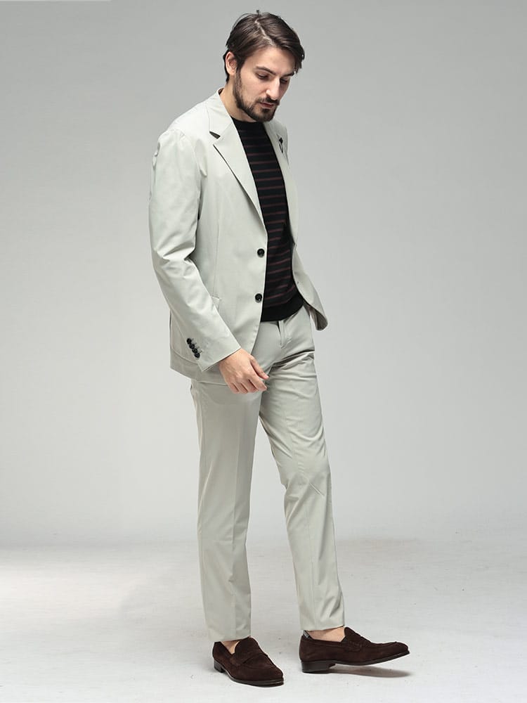 イタリアの名門LARDINI(ラルディーニ)から、現代のビジネスシーンに最適なストレッチナイロン素材のセットアップが登場。高機能なポリアミドにエラスタンを混紡した極上のストレッチ生地が、スマートなシルエットを維持しながら、驚くほど軽やかでストレスフリーな着心地を実現します。ジャケットは袖裏のみの軽快な仕立てに、パンツは洗練されたノータック仕様を採用。ナイロン特有の微光沢が都会的なスポーティさと高級感を演出し、出張や移動の多い日でもシワを気にせず品格を保てるのが魅力です。伝統的なサルトリアの技術と革新的な素材が融合した一着は、オンオフを問わずアクティブに活躍する、次世代のビジネスエッセンシャルです。