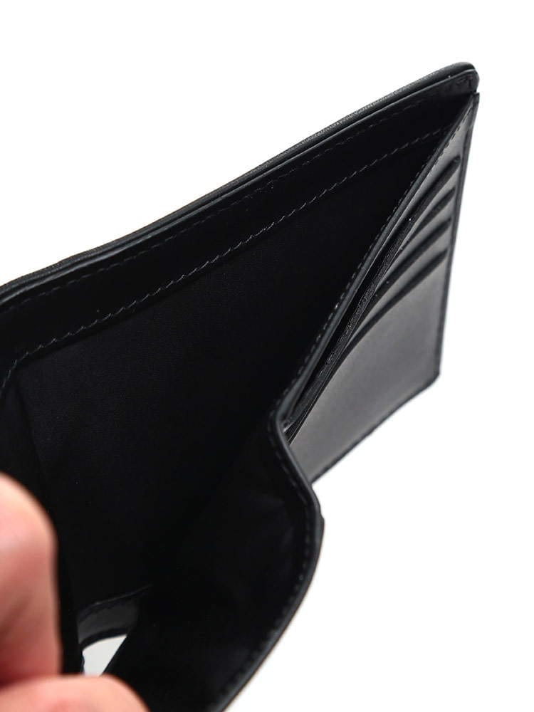・マットなレザーにキルティングデザインとタグをあしらった二つ折り 財布