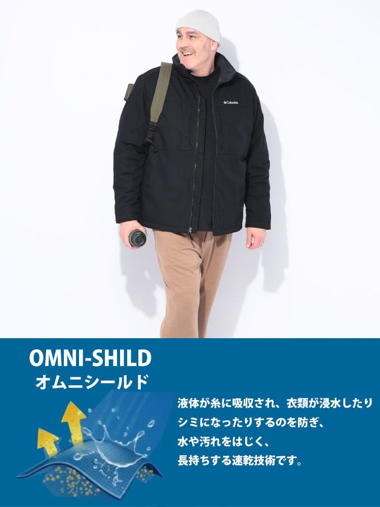 クラシカルな佇まいと確かな暖かさ!名作ロマビスタ。コロンビアを代表するロングセラー、ロマビスタ 3 ジャケット。耐久性の高いT/C(ポリエステル・コットン)生地を採用し、さらに「OMNI-SHIELD(オムニシールド)」による撥水防汚機能をプラス。アクティブシーンでのタフさと日常での使いやすさを両立しました。裏地は身頃からフードまで肌触りの良いフリース仕様で、優れた保温性を発揮。さらに中綿を封入しているため、冷たい外気からしっかりと身を守ります。スマートなスタンドカラーデザインで、カジュアルからワークテイストまで幅広くフィット。秋冬の定番アウターとして、手放せない一着です。
