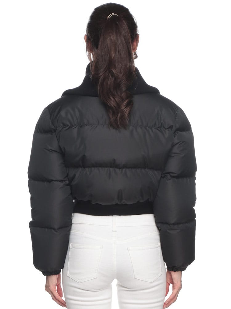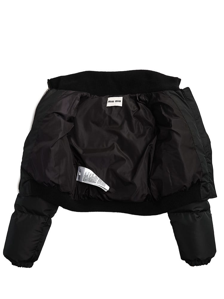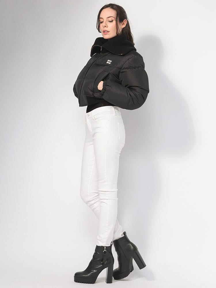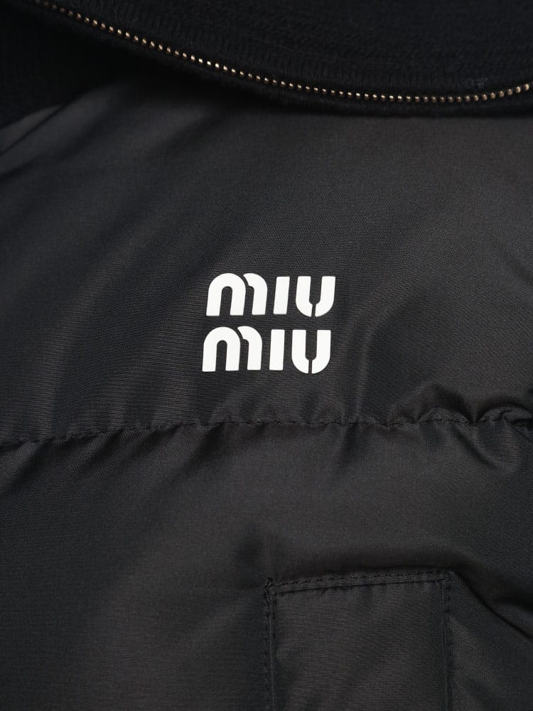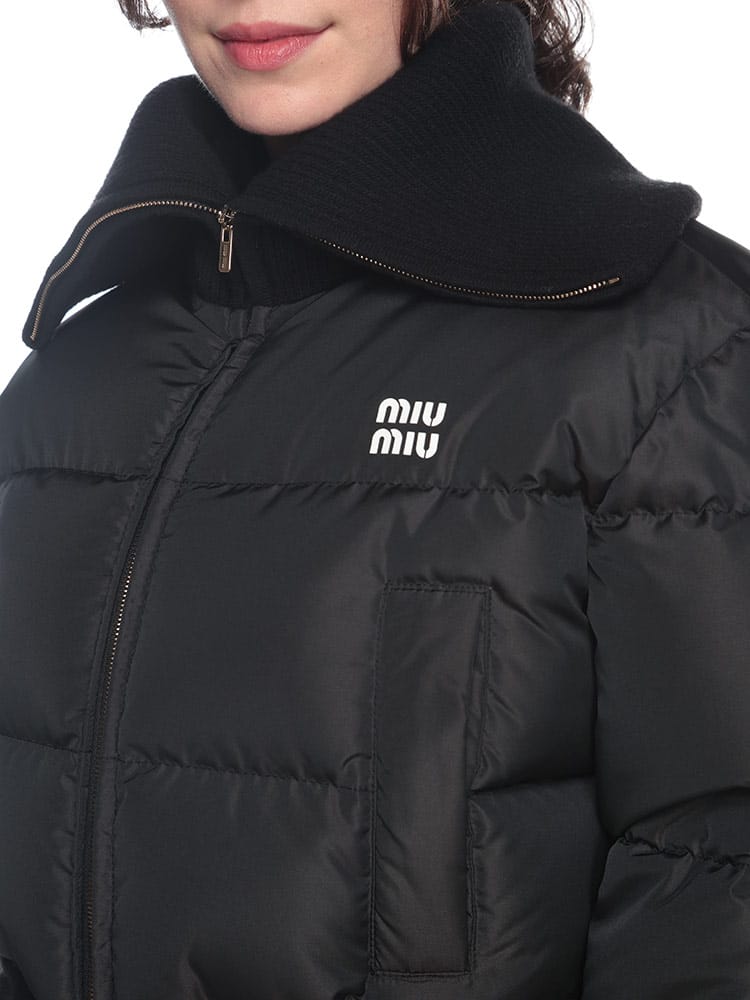MIU MIUのニットカラー ショート丈 クロップド ダウンジャケットは、都会的なエレガンスとカジュアルさを融合した一着です。上質なダウン素材が寒さからしっかりと守り、ショート丈のデザインがスタイルアップ効果をもたらします。柔らかなニットカラーは首元を暖かく包み込み、トレンド感をプラス。軽量でありながら保温性に優れており、秋冬のアウターとして最適です。様々なコーディネートにマッチするこのジャケットは、洗練されたスタイルを求める方におすすめのアイテムです。