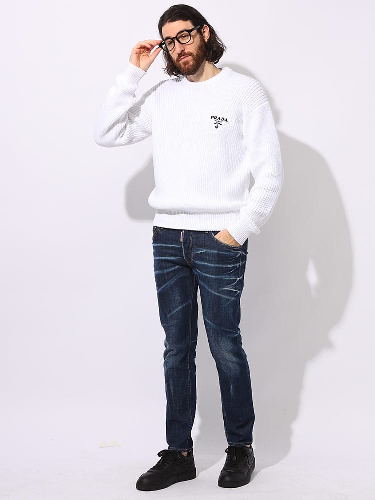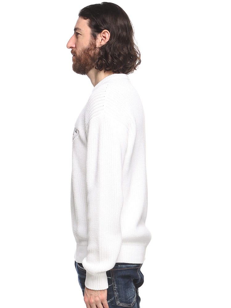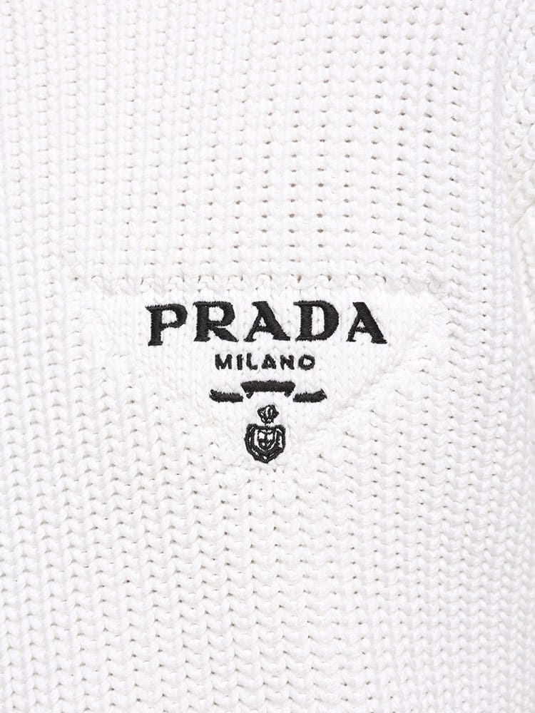 PRADA(プラダ)のクルーネックセーターは、コットン素材で快適な着心地を提供します。左胸にはブランドのロゴマークが刺繍され、シンプルながらも高級感のあるデザインです。洗練されたスタイルを演出する一着です。