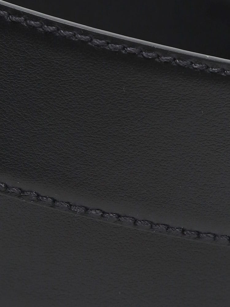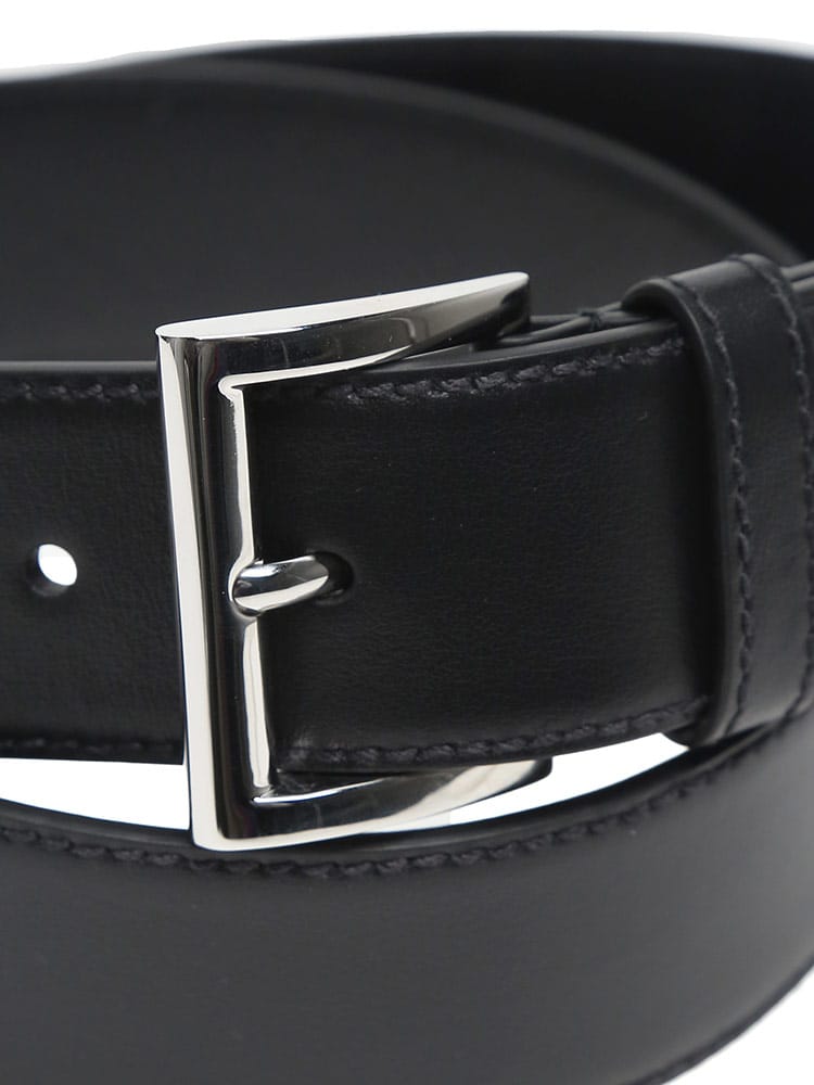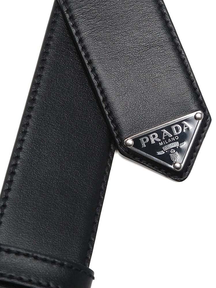メタルバックルを備えた、上品で洗練されたデザインのベルト。先端にあしらわれたトライアングルロゴが存在感を放つスタイル。