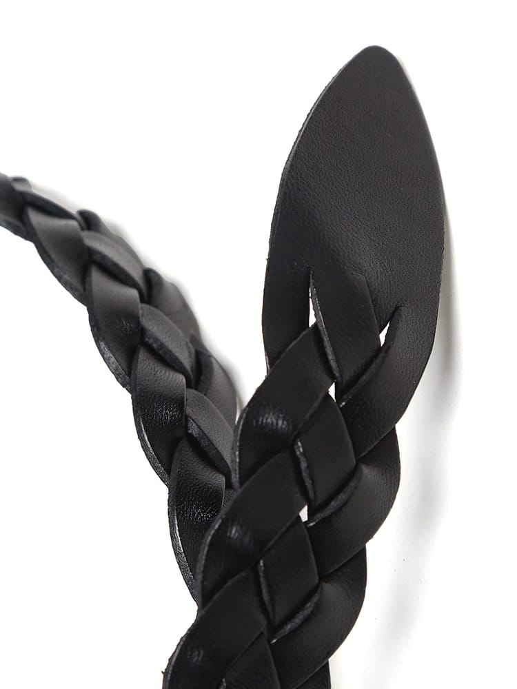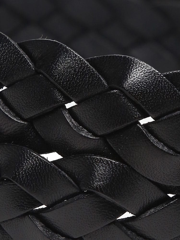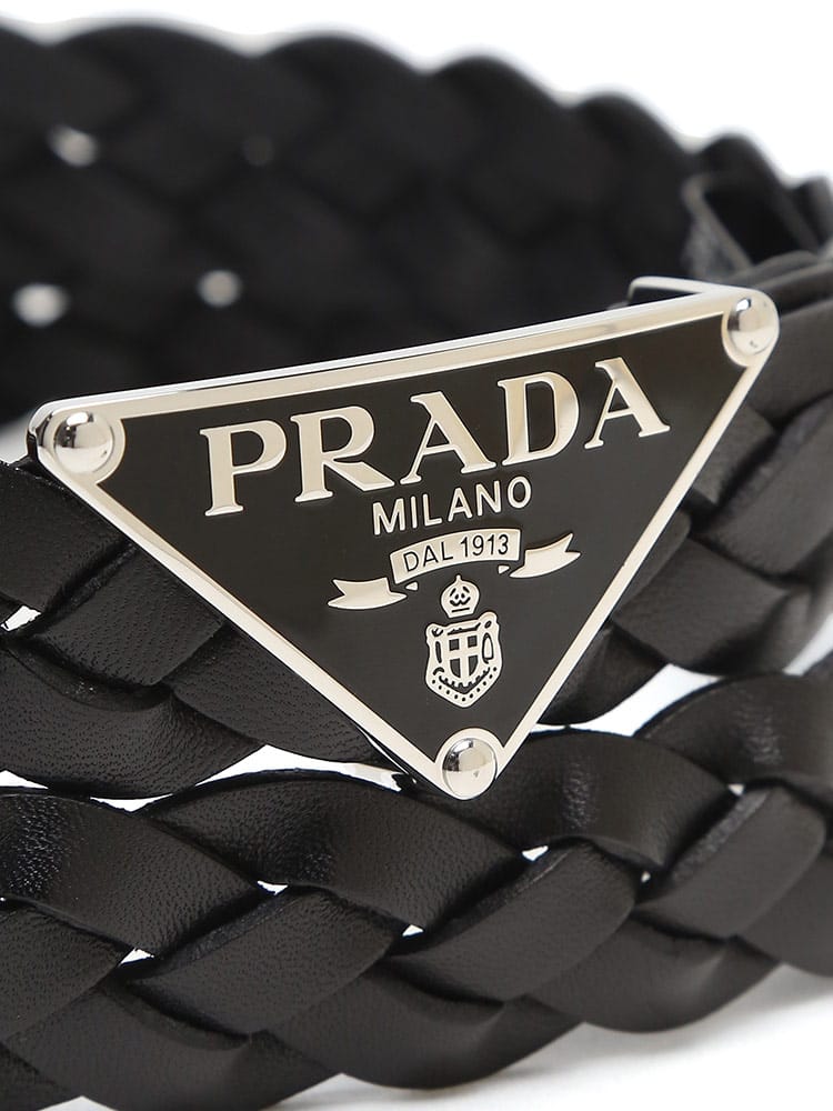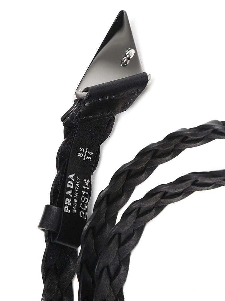 洗練されたブレイドモチーフをあしらい、カジュアルでありながらエレガントな魅力が光るベルト。プラダのコレクションを象徴するシグネチャーであるアイコニックなトライアングルを想起させるエナメルメタルのバックルが備わっています。