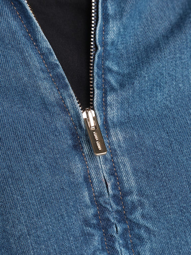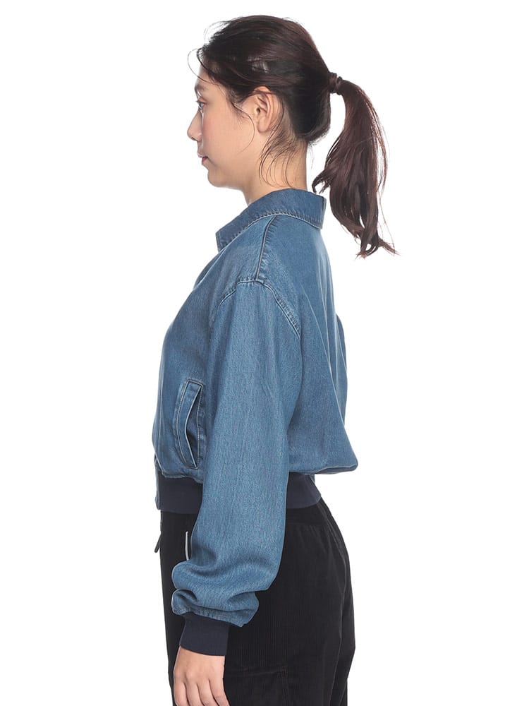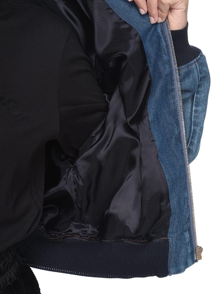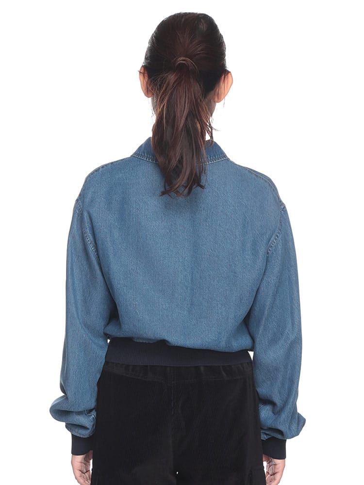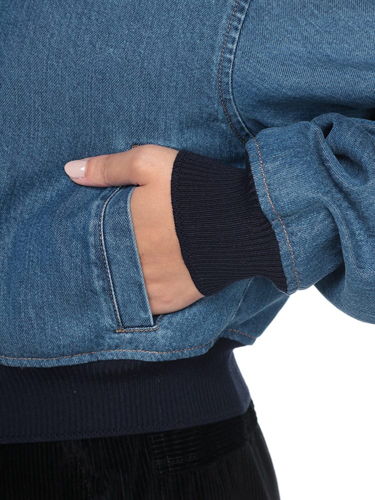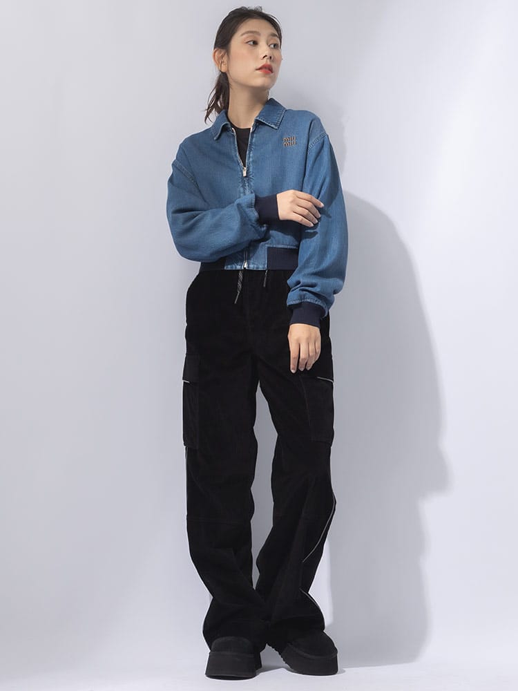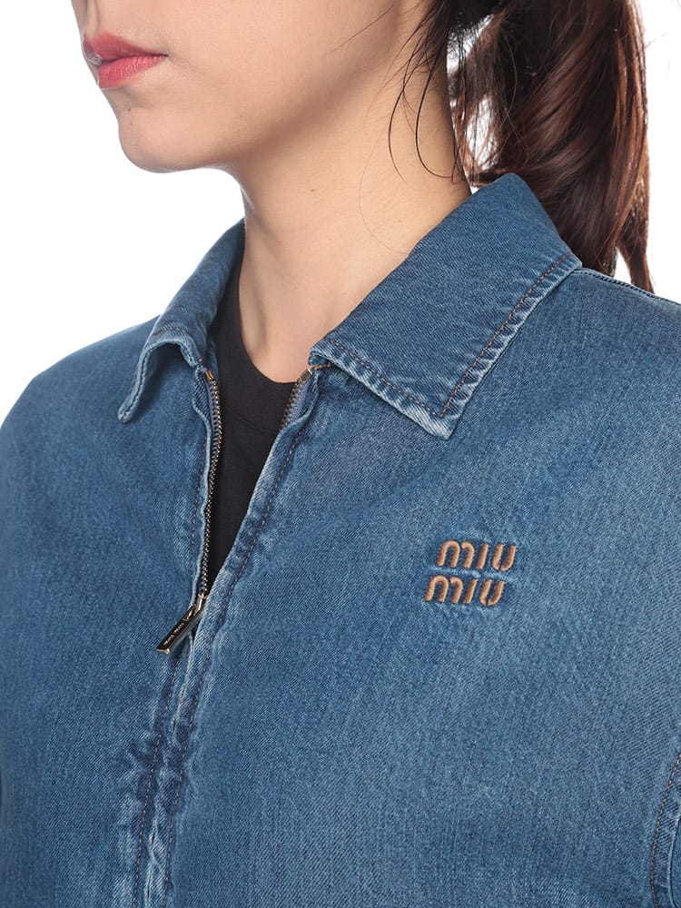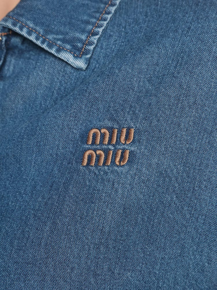 伸縮性のある袖口や裾などのシャツやスポーツウェアのディテールをあしらった、カレッジスタイルのインスピレーションが漂うデニムブルゾンジャケット。コントラストの効いた刺繍のMIU MIU ロゴがミュウミュウらしい個性をプラスするスタイリッシュなアイテム。ウォッシュ加工。ライニング付。クラシックフィット。シャツスタイルの襟。長袖、ニットの袖口。ファスナー開閉式。コントラストの効いたトップステッチ。ウェルトポケット。伸縮性のある裾。