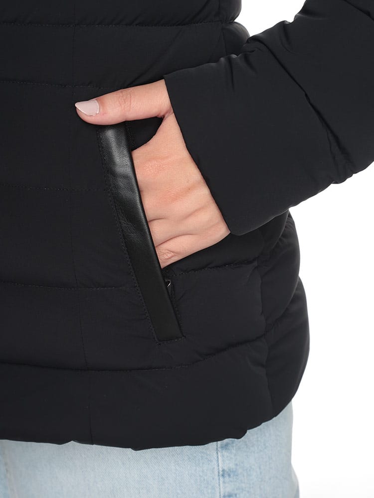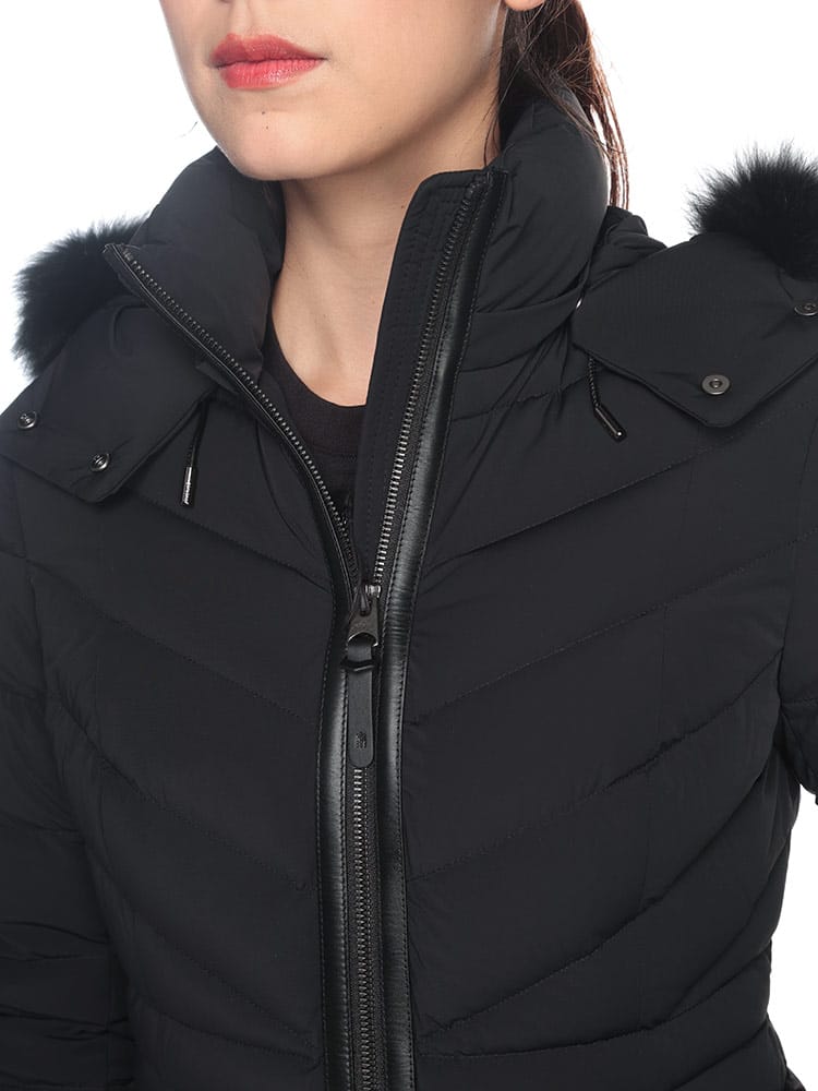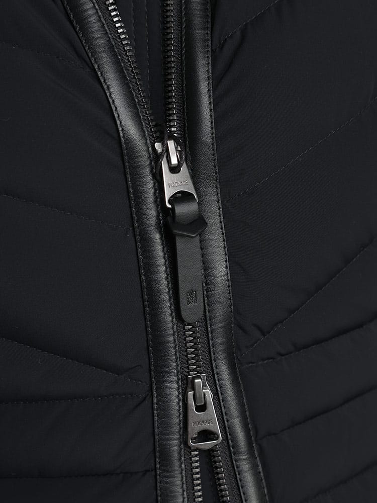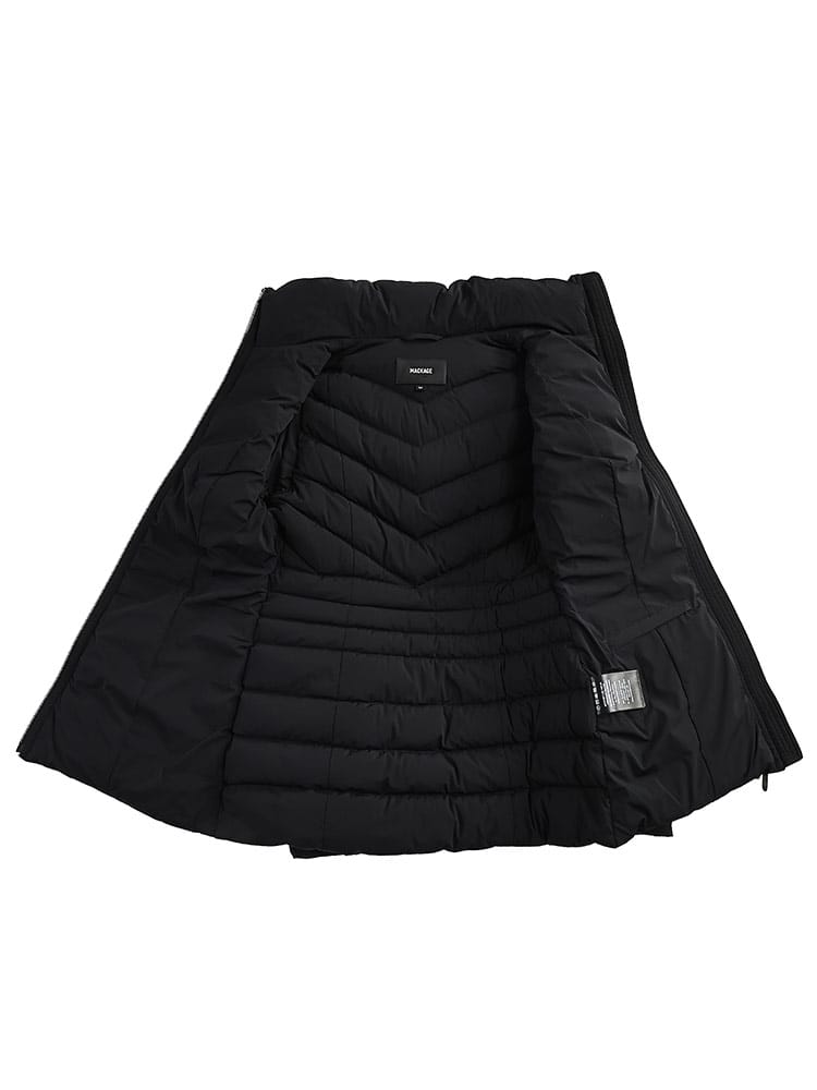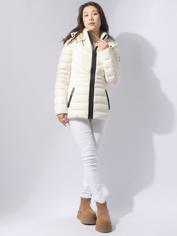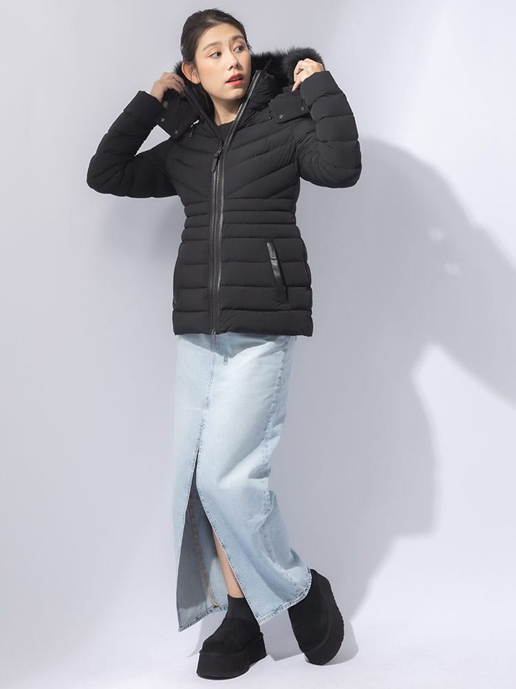 MACKAGEが誇る、最強ストレッチダウン。マルチWAYストレッチ素材を使用し、あらゆるシーンに対応するストレスフリーの着心地を実現。マットな質感の生地と女性らしさを引き立てる美しいシェイプラインは、着ぶくれせず品のある一着。レザー使いのディテールがラグジュアリー感を演出。撥水性の高い生地で水をはじきます。通気性の高い生地で保温性を高めます。フード内側についているドローコードを絞ることにより、フードのずり落ちを防ぎます。