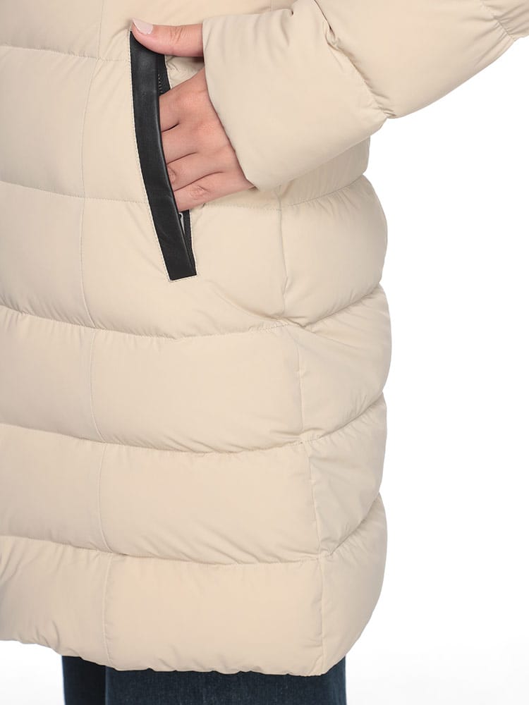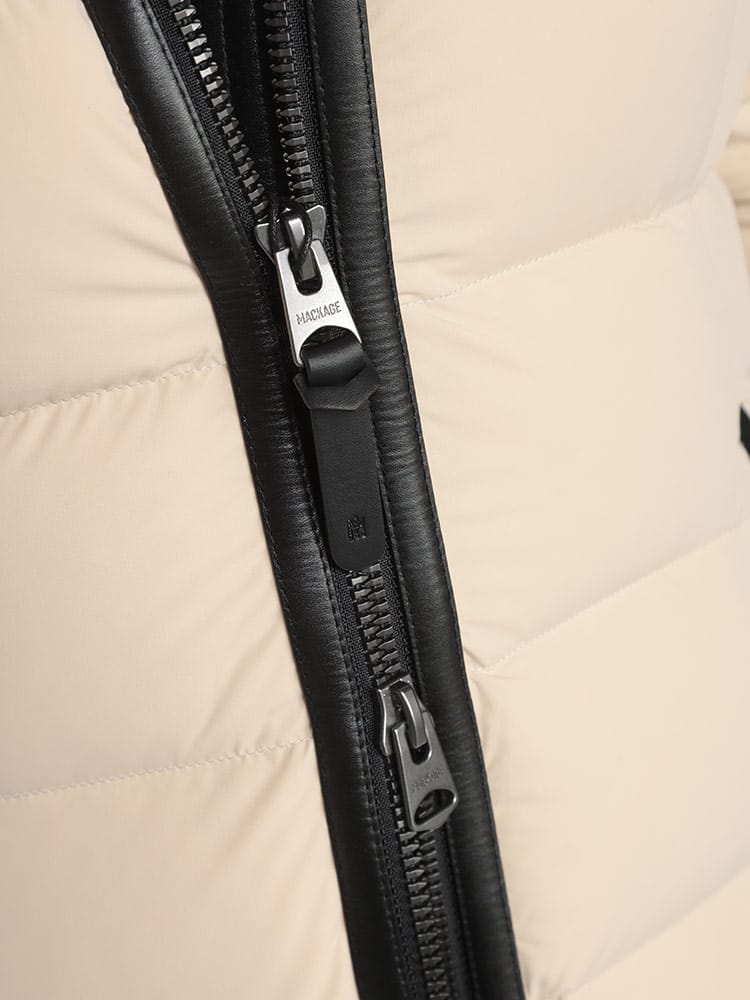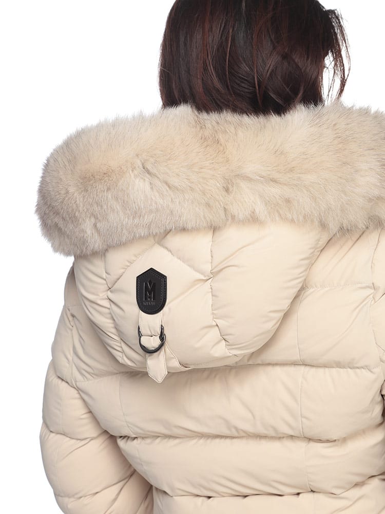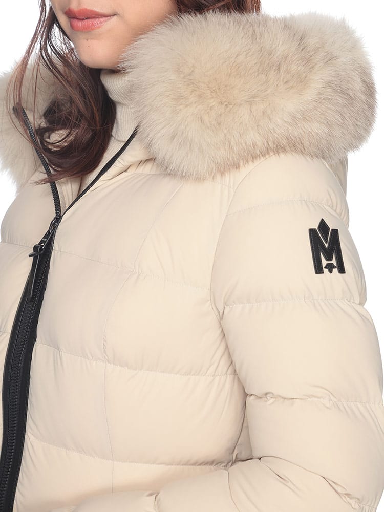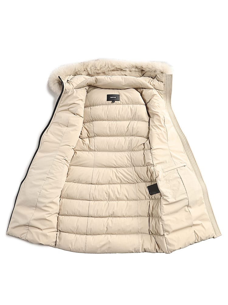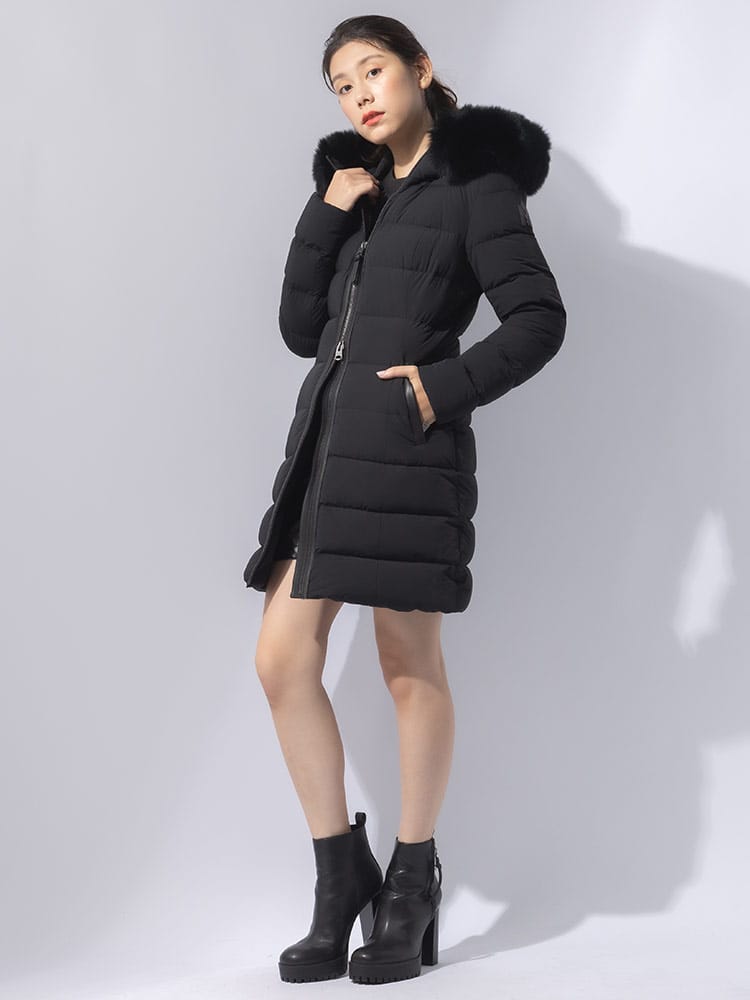 MACKAGEが誇る、最強ストレッチダウン。マルチWAYストレッチ素材を使用し、あらゆるシーンに対応するストレスフリーの着心地を実現。ネックからショルダーラインを覆う贅沢なファー使いは、他にはないMACKAGEのシグニチャーモデル。マットな質感の生地と、女性らしさを引き立てる美しいシェイプラインは、着ぶくれせず品のある仕上がりに。レザー使いのディテールも高級感ある一着。撥水性の高い生地で水をはじき雨にも対応します。通気性の高い生地で保温性を高めます。スナップボタンを留めることで暖かくすっきりと着ていただけます。内側にもポケットが付いています。