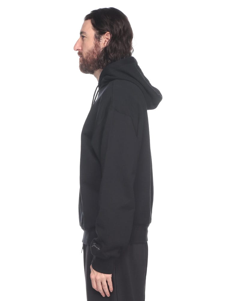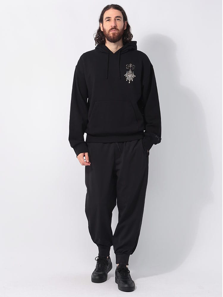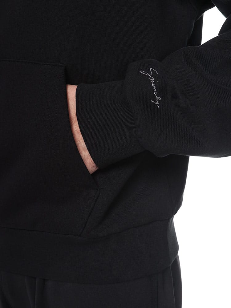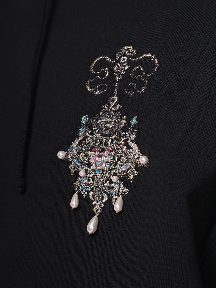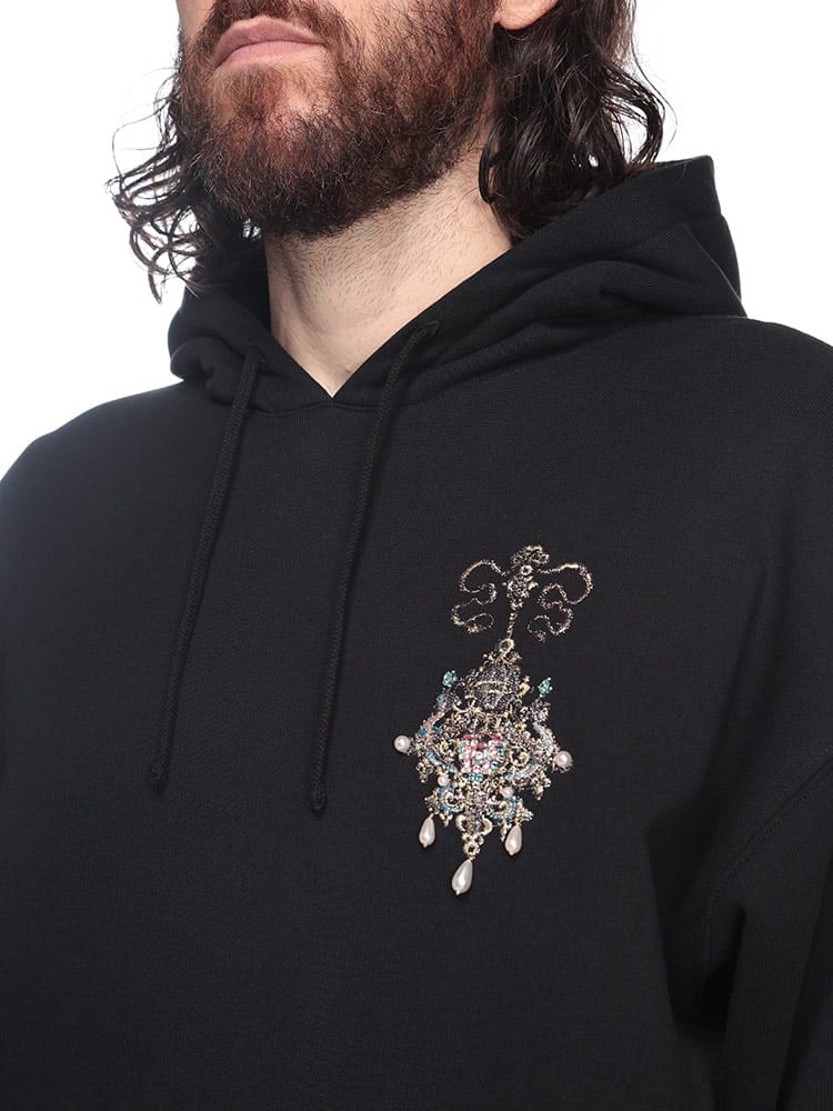 ソフトフリースのロングスリーブ フード付きスウェットシャツ。胸元にルレックス糸で刺繍されたシャンデリアと手刺繍のパール。左袖にルレックス糸で刺繍された小さなGIVENCHYロゴ。フードにドローストリング。フロントにカンガルーポケット1つ。リブ編みヘム&カフ。クラシックフィット。