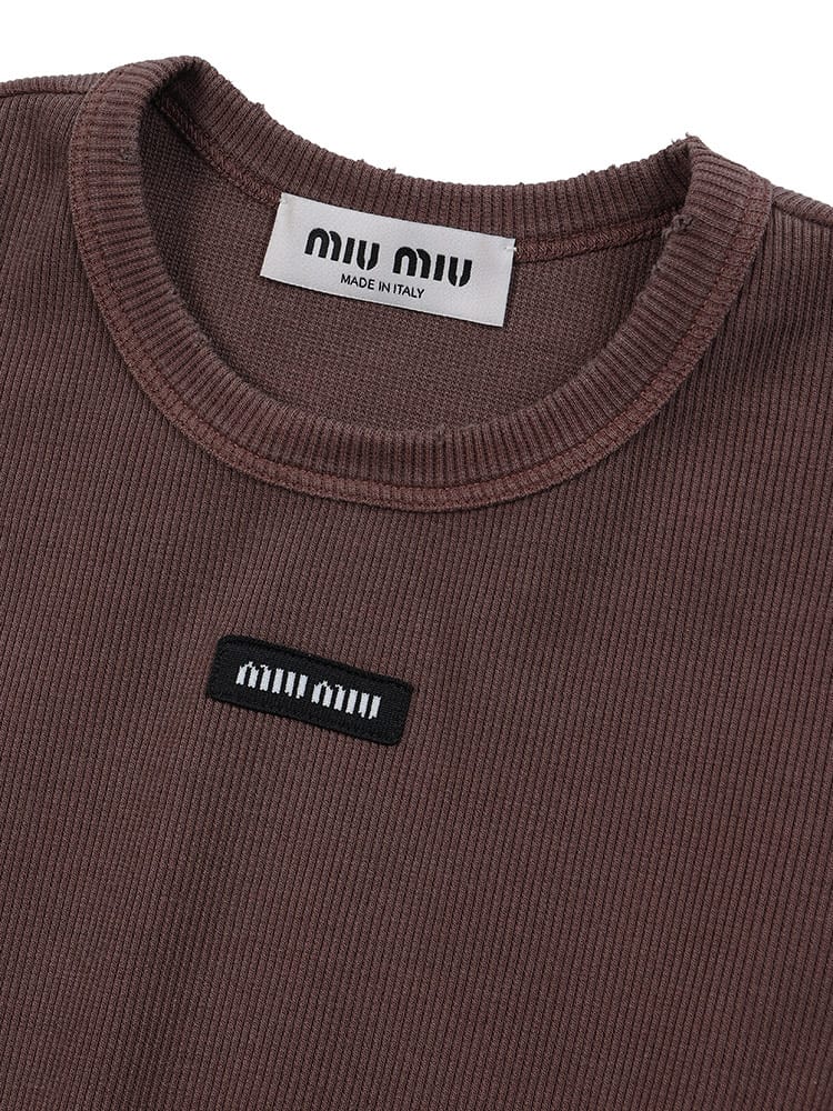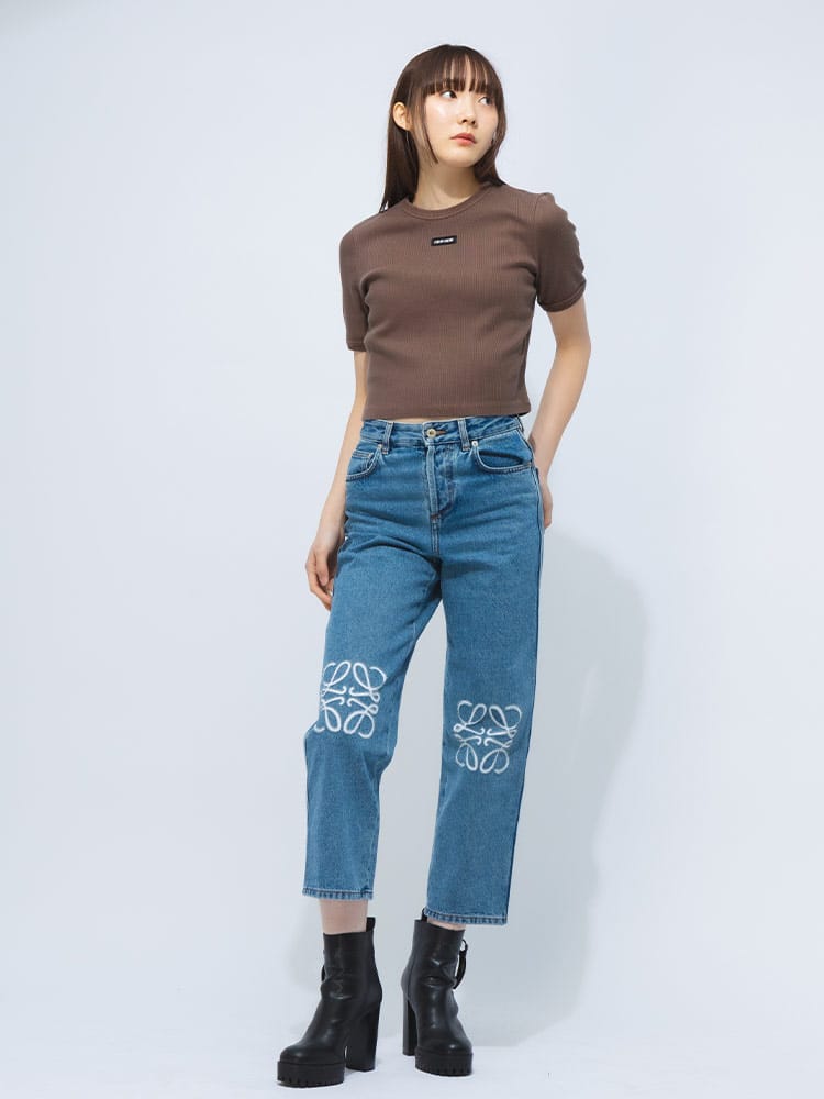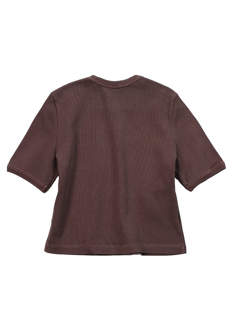 リブ素材でストレッチ感のあるクルーネックTシャツ。ダメージ加工やウォッシュ加工を施した遊び心満載の一枚。クロップド丈がトレンド感を演出。カジュアルなスタイルはもちろん、スカートと合わせてフェミニンな着こなしも楽しめます。
