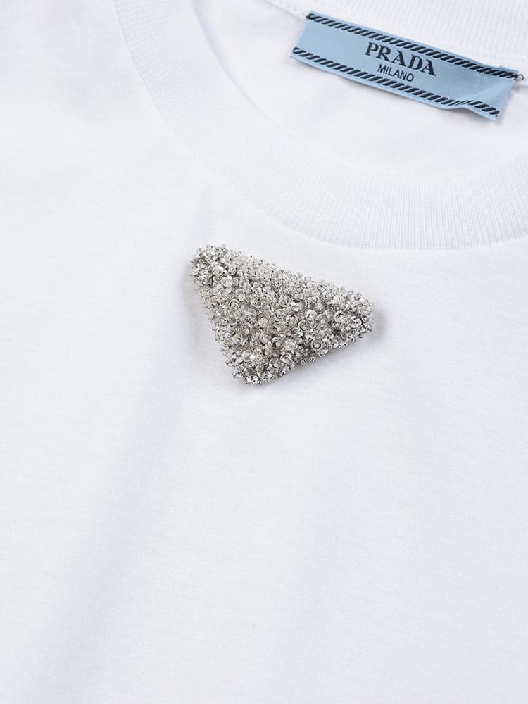 モダンな魅力を湛える半袖のコットンジャージーTシャツ。リラックスしたシルエットにトライアングルロゴの刺繍を飾り、ウェアにエレガントな立体感をプラスしています。