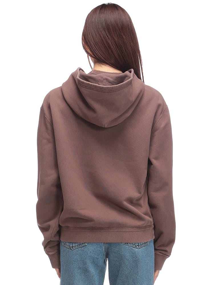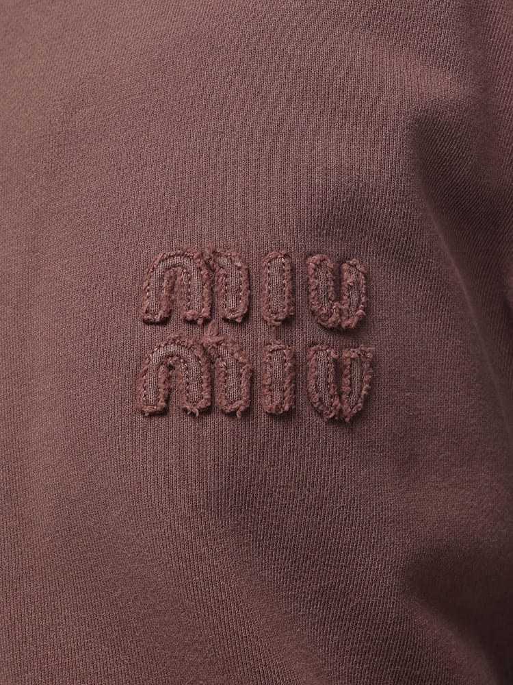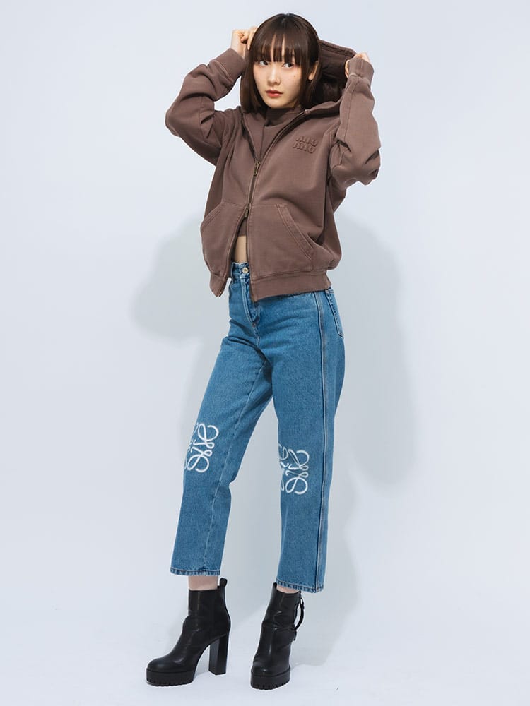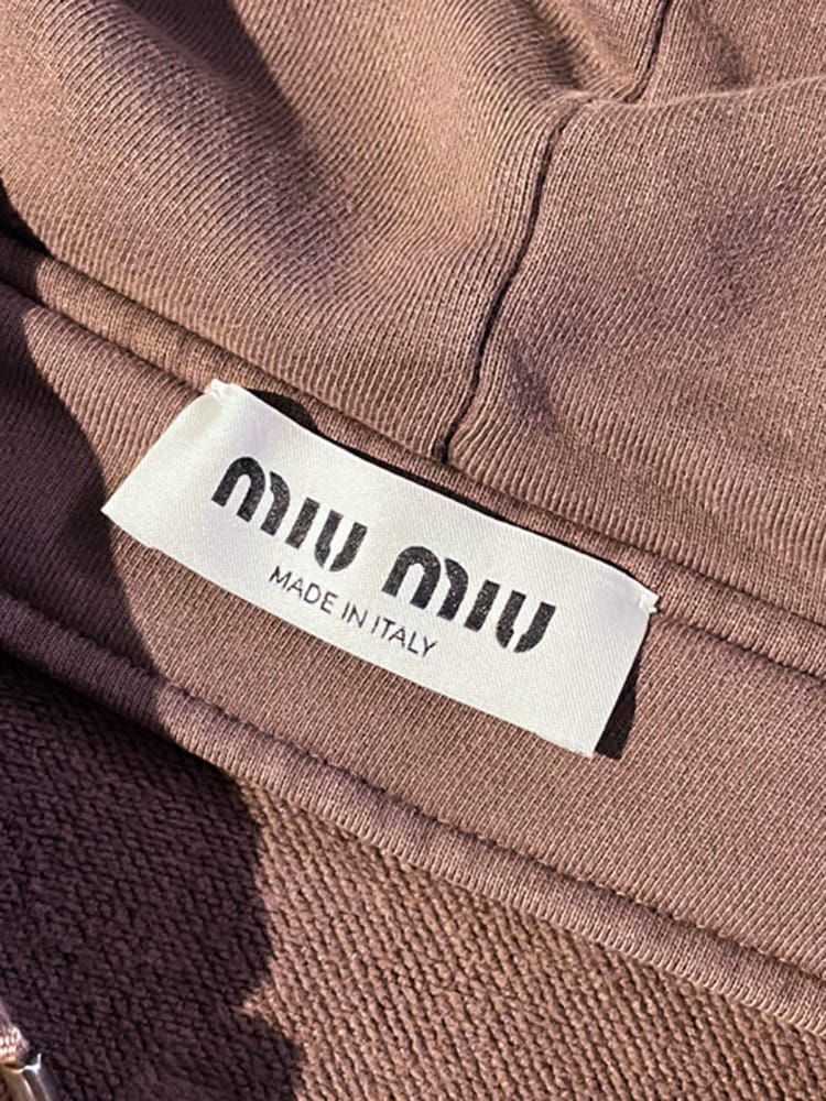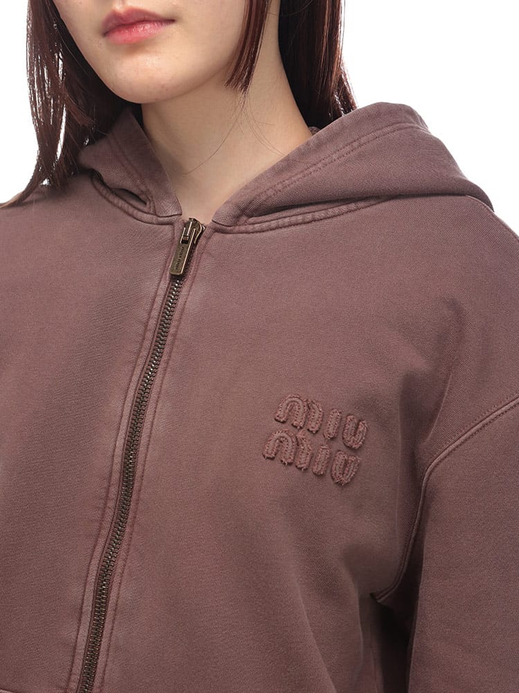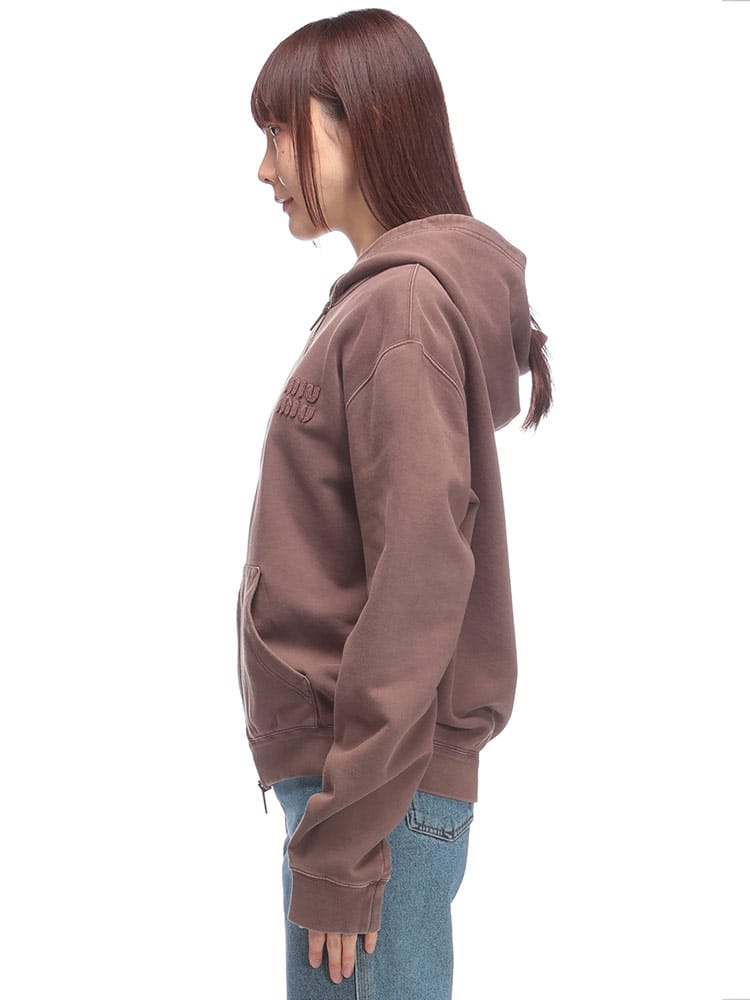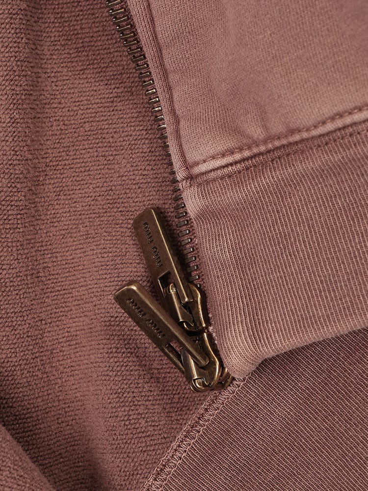ミュウミュウのジップパーカーは、後染め加工による独特の色合いが魅力。オーバーサイズのシルエットと、ブランドらしい遊び心のあるデザインが特徴です。コットンフリース素材で着心地も抜群。カジュアルなスタイルはもちろん、ドレスアップも可能です。
