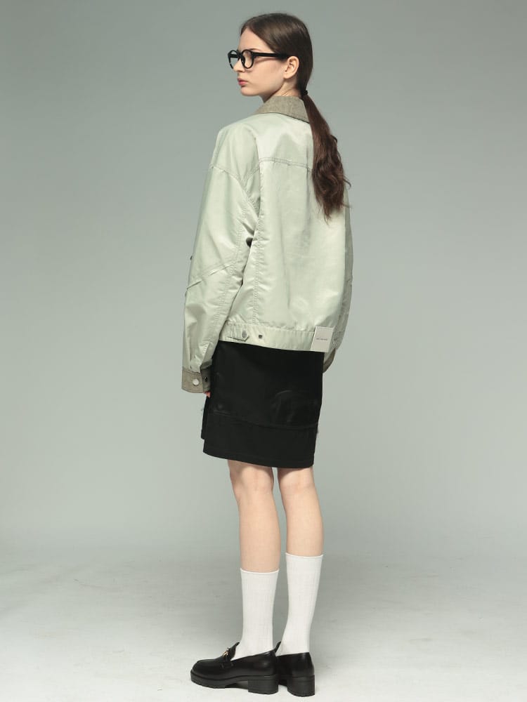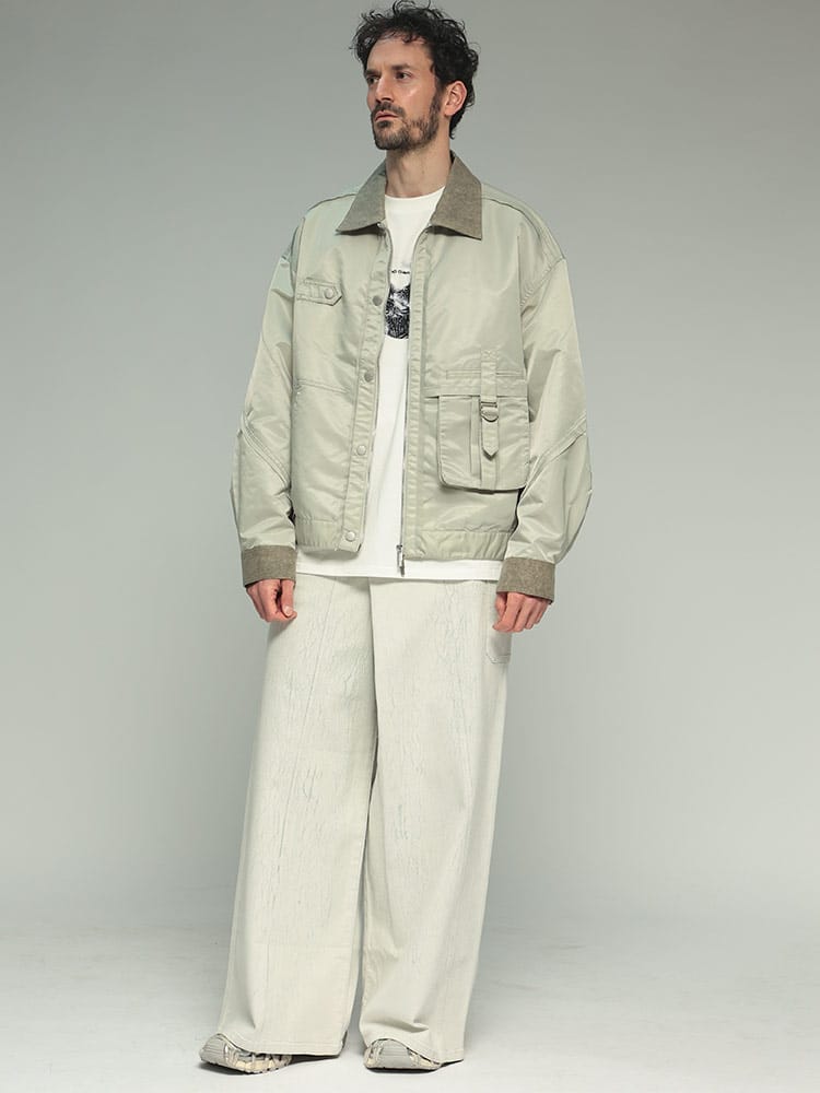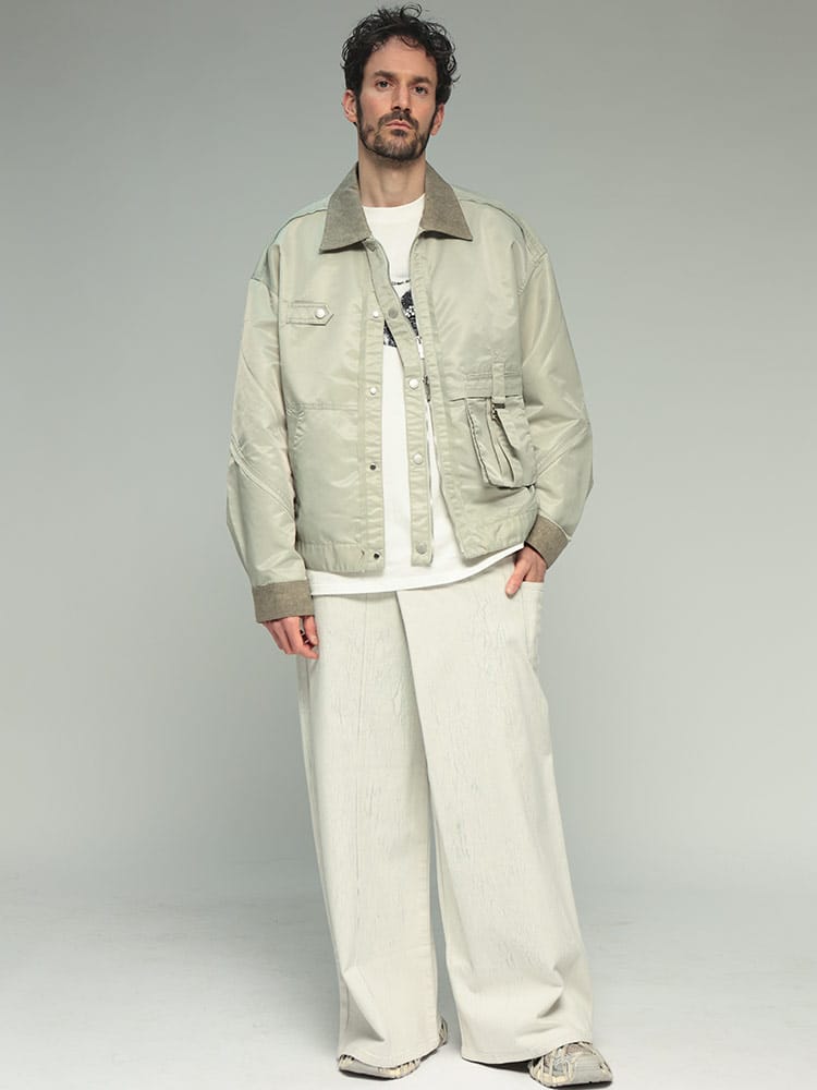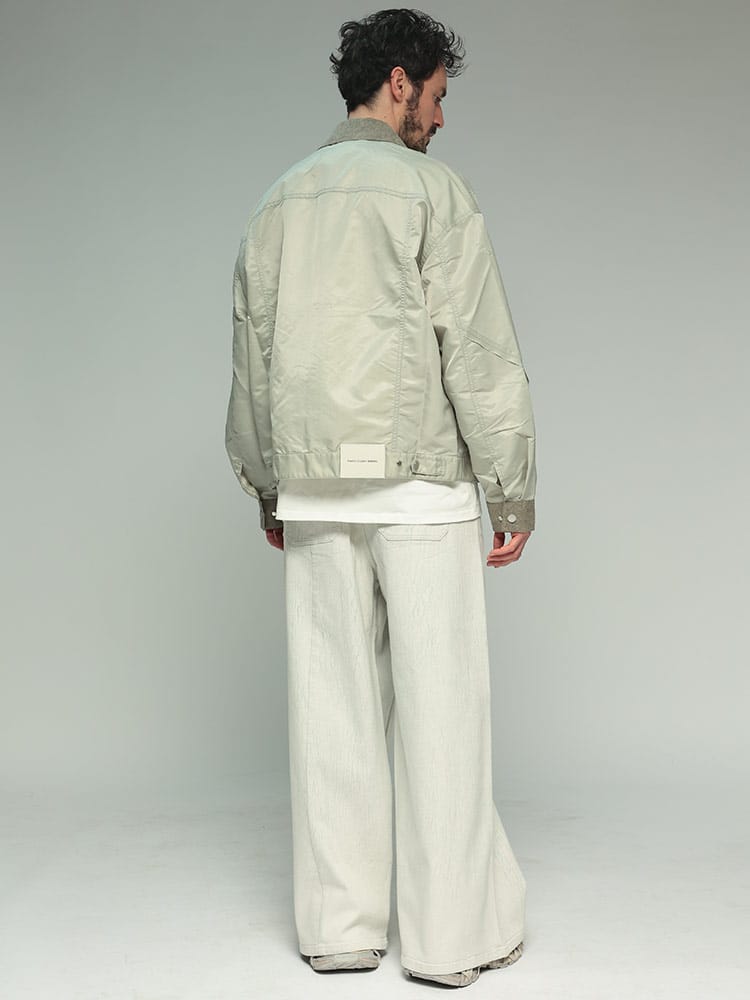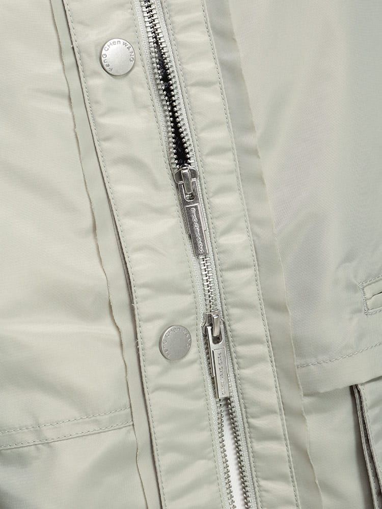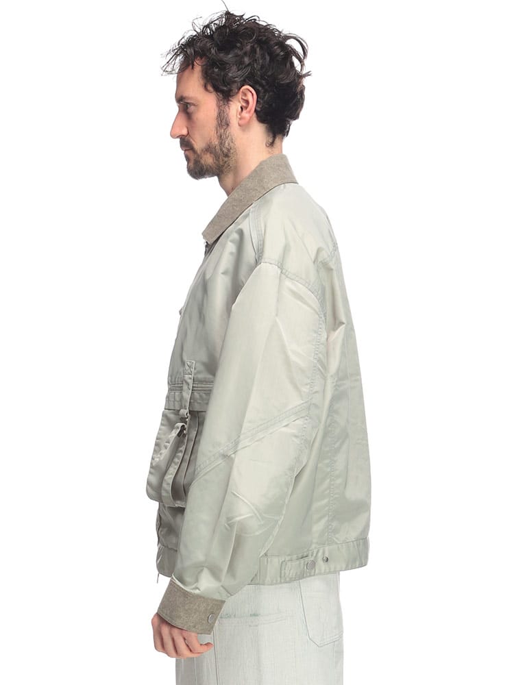 このワークウェア ジャケットは、伝統的な中国の青磁からインスピレーションを受けています。さまざまな着こなしが可能なダブル プラケット デザインが特徴です。