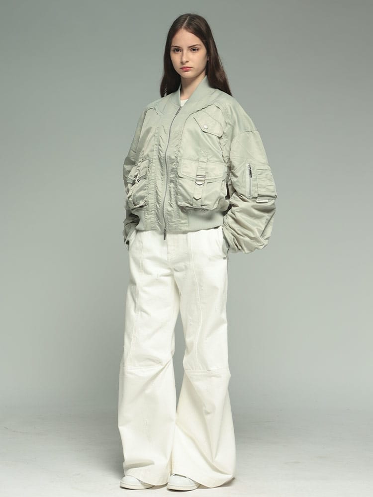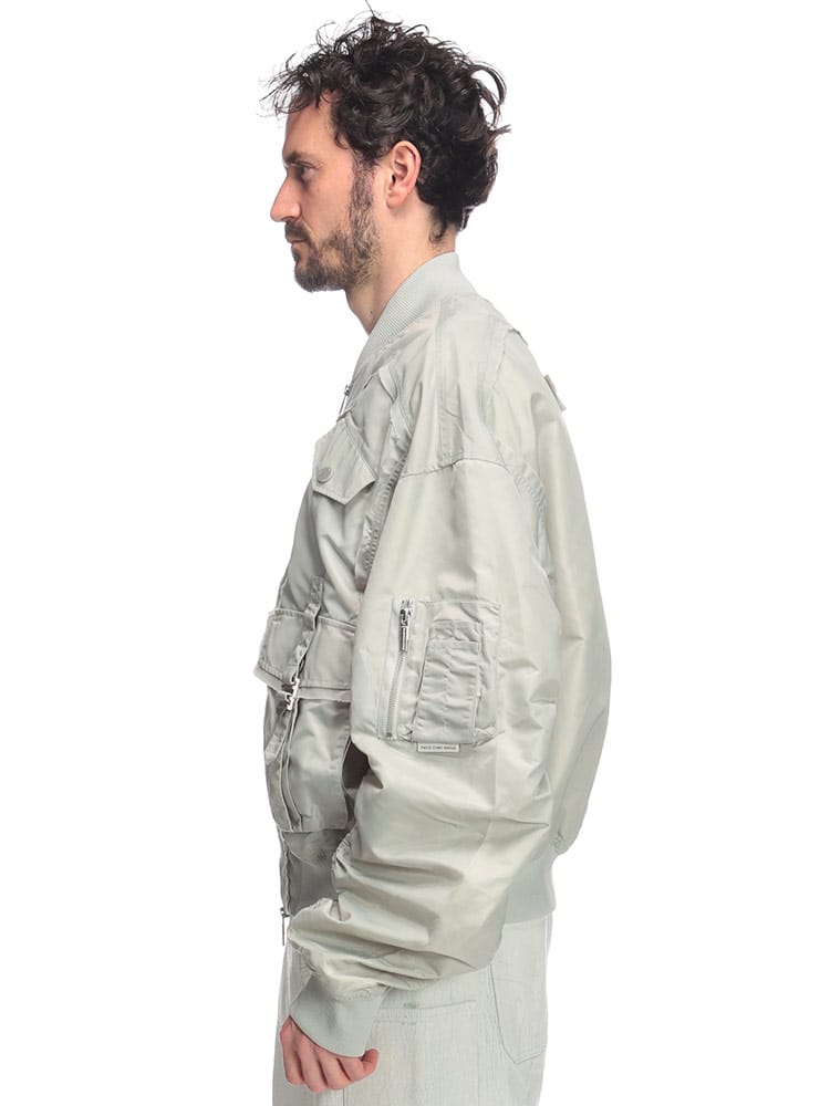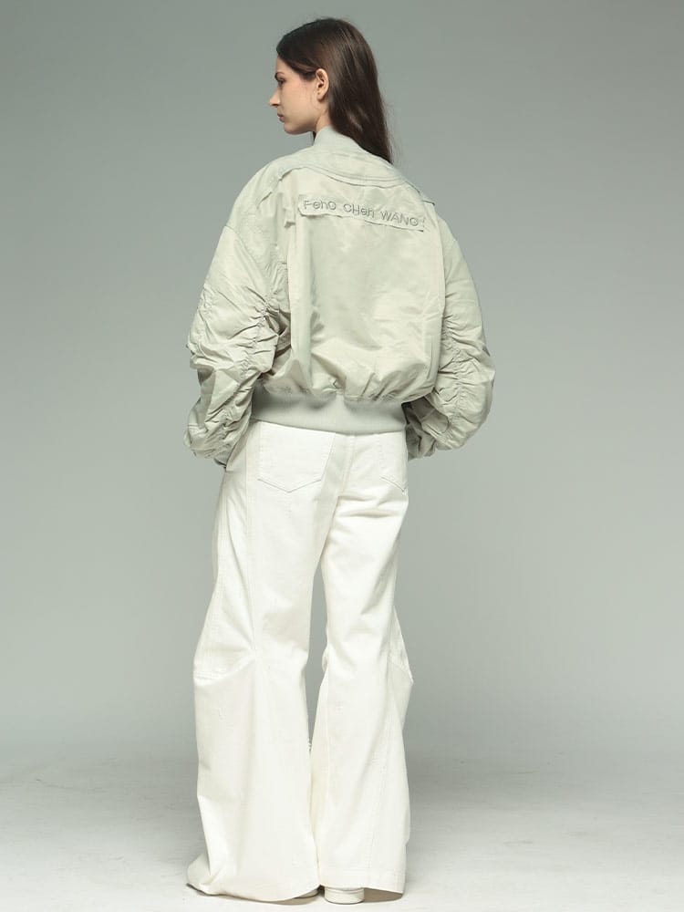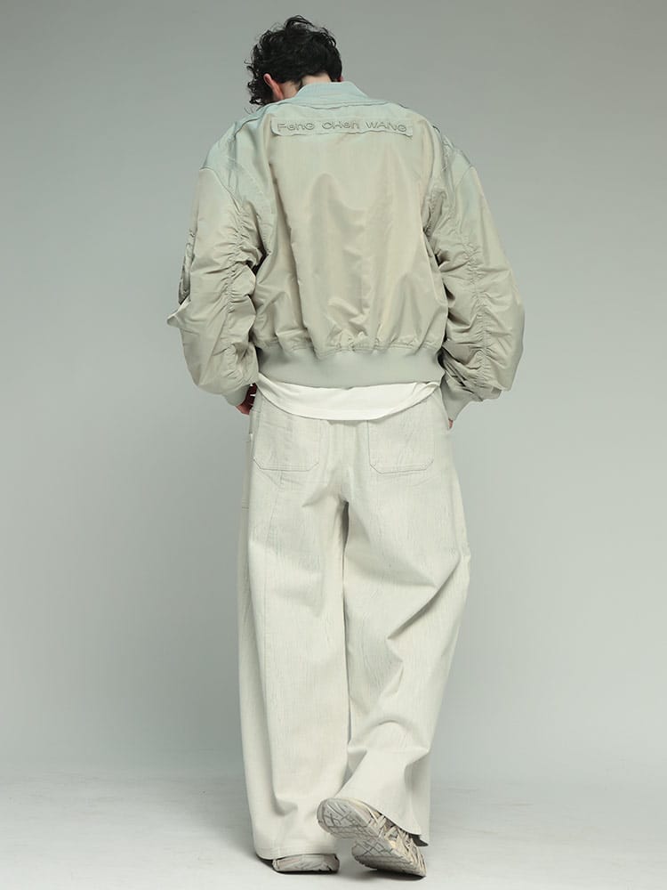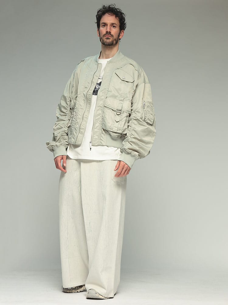 伝統的なボンバージャケットのシルエットに、多数のポケットとフルジップのデザインが特徴です。機能性とデザイン性を兼ね備えた、Feng Chen Wangらしい一着と言えるでしょう。