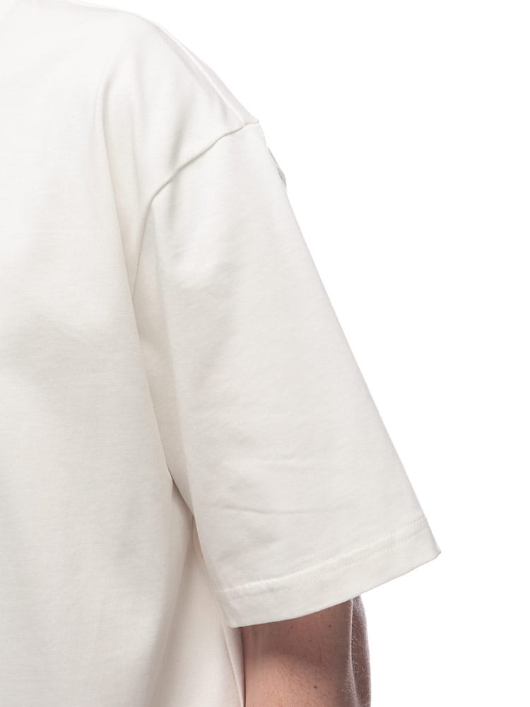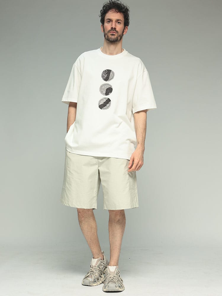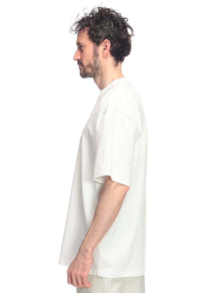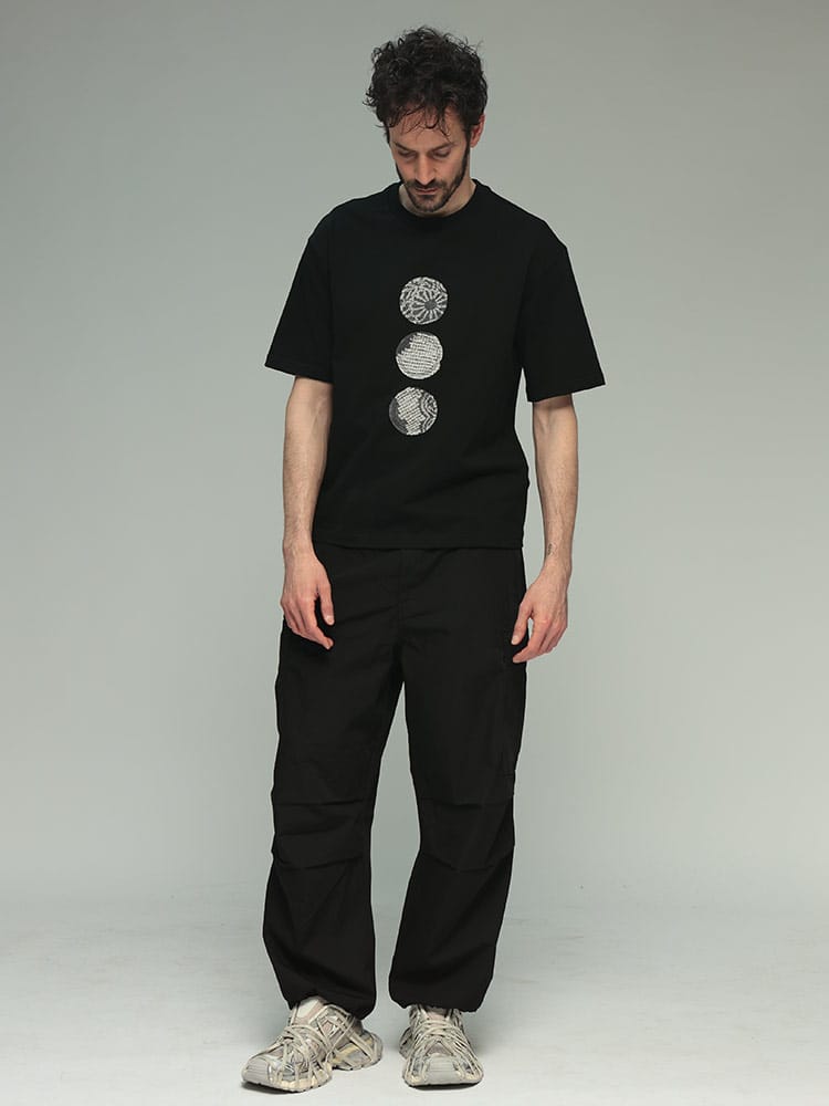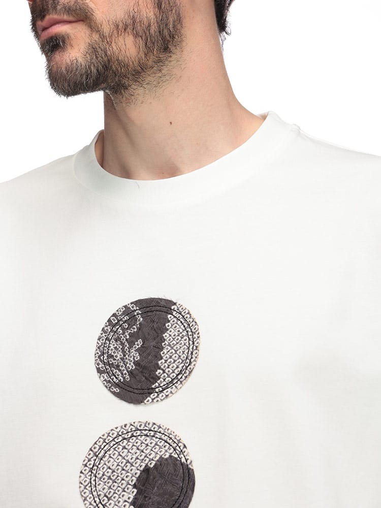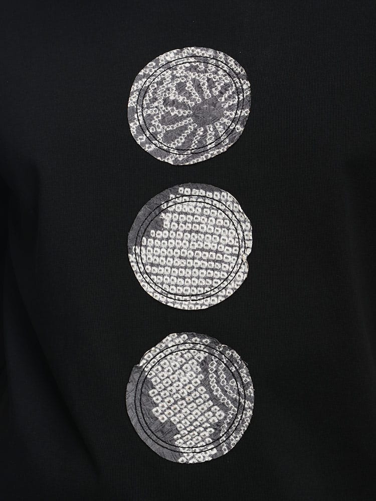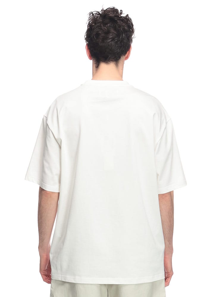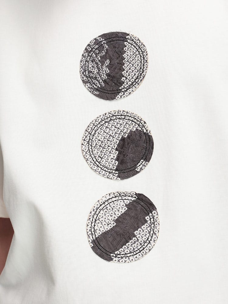 フロントに施されたパッチが特徴的なデザインで、Feng Chen Wangらしいアシンメトリーなパターンや、切りっぱなしの裾など、細部にまでこだわりが感じられます。カジュアルながらも洗練された印象を与える、着回し力の高いアイテムです。