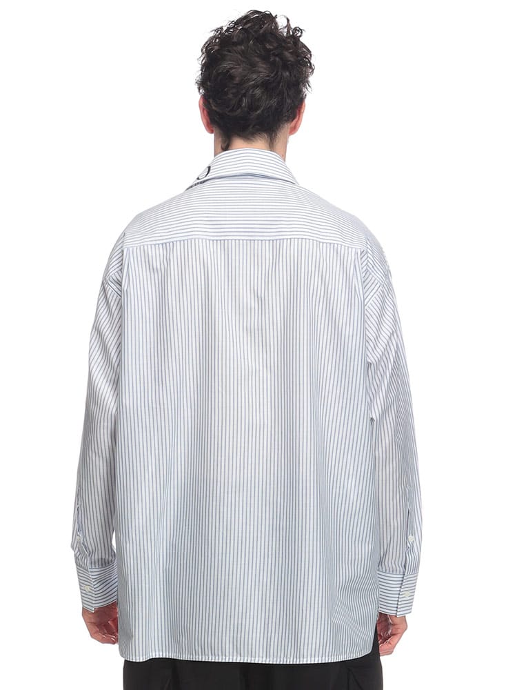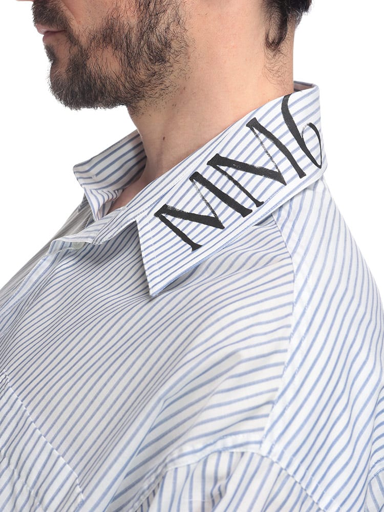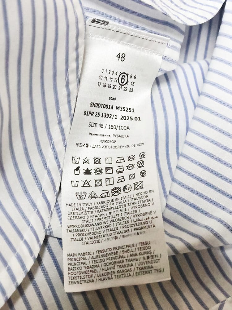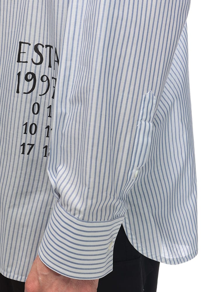 クラシックなテーラードスタイルに現代的なひねりを加えたストライプポプリンシャツ。抽象的な視覚的変化を取り入れています。サイドと襟元には、MM6の手書き風テキストプリントがあしらわれています。バックには控えめな白いステッチラインが施され、メゾンを象徴する脱構築的アプローチをさりげなく強調しています。