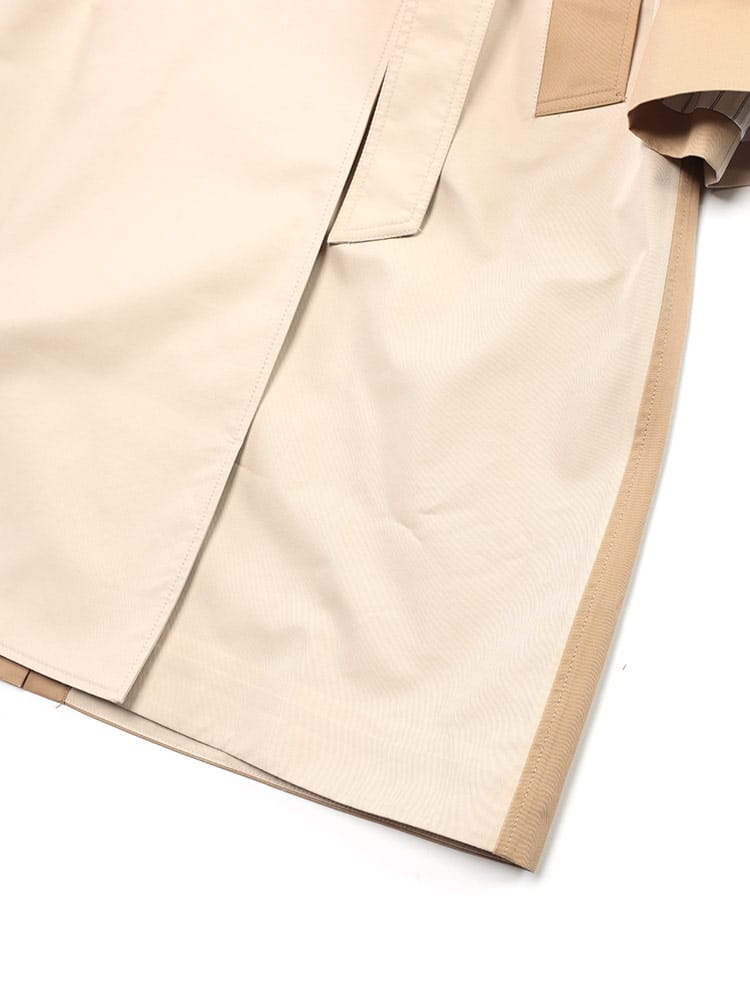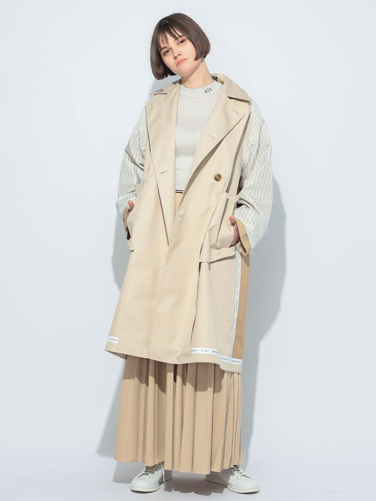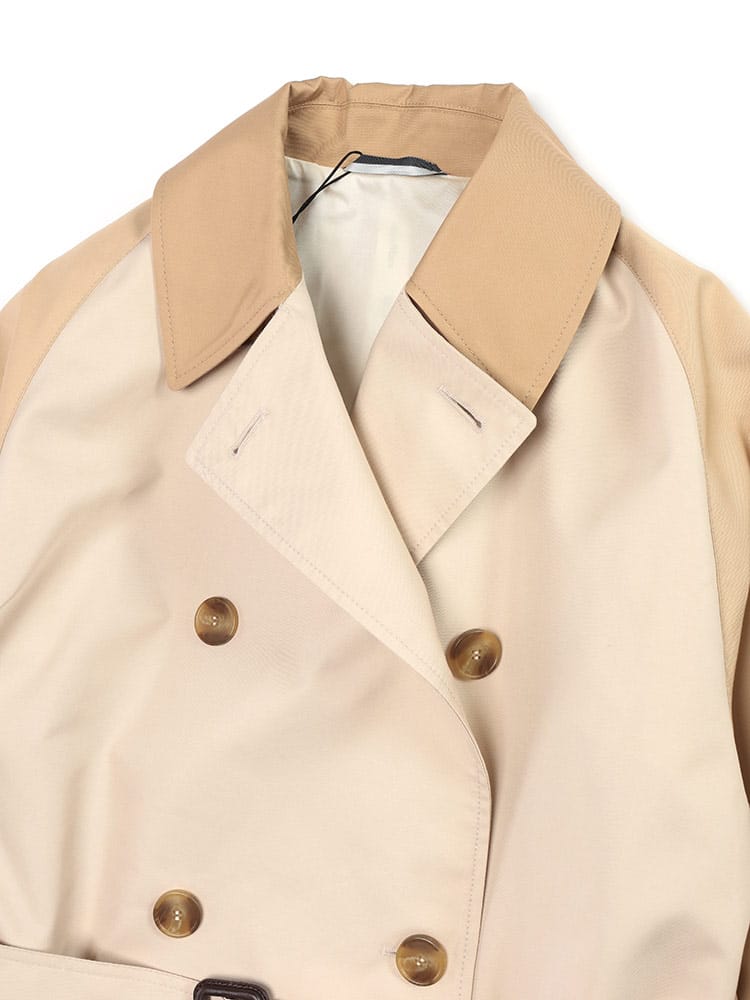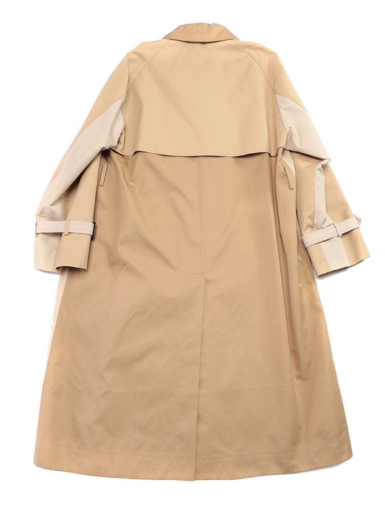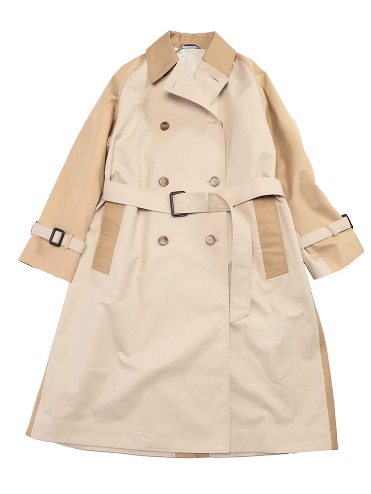 コットンとポリエステルをブレンドしたテクニカル素材を使用し、軽やかな着心地と美しいシルエットを実現。リバーシブル仕様で、シーンや気分に合わせて2つの表情を楽しめるのが魅力。クラシカルなトレンチコートのデザインは、オンオフ問わず活躍。付属のベルトでウエストマークすれば、より女性らしいシルエットに。外側と内側にそれぞれ2つのポケットを備え、機能性も抜群。春先のワードローブに欠かせない、タイムレスな魅力を放つ一着です。