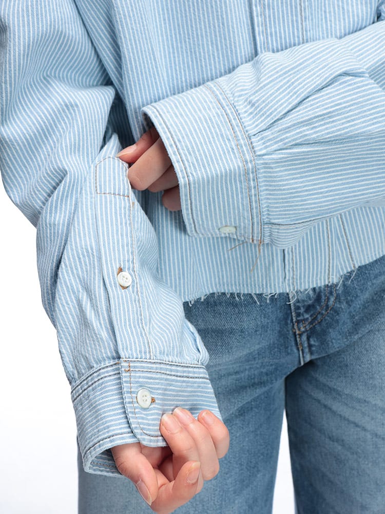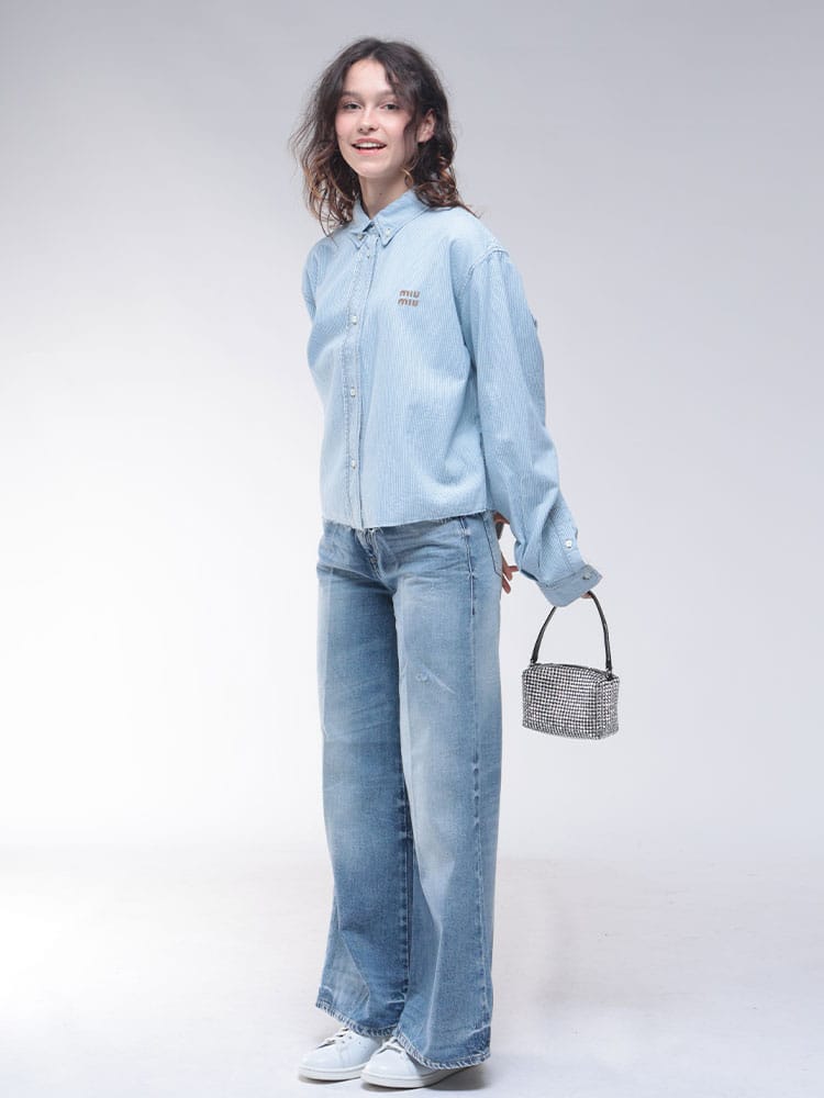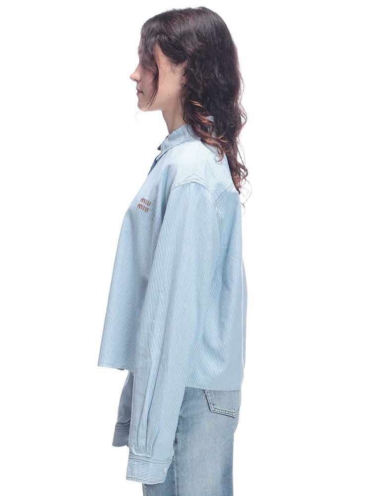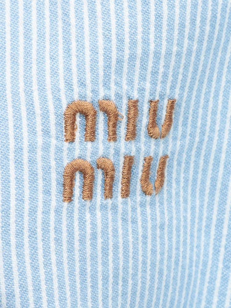 特別なブリーチ加工が施されたシャンブレーデニムのライトストライプが目を引くクロップドシャツが登場。クラシックなフィット感はそのままに、夏らしいヴィンテージの美学を感じさせる着古したような風合いが魅力です。ウォッシュ加工によって表現された絶妙な色合いと、コントラストの効いたトップステッチが洗練された印象を与えます。裏地なしで軽やかに羽織れる長袖デザインは、これからの季節にぴったり。シャツ襟とフロントボタン留めで、きちんとしすぎない大人のカジュアルスタイルが完成します。刺繍ロゴがさりげなくブランドを主張する、ミュウミュウらしい一枚です。