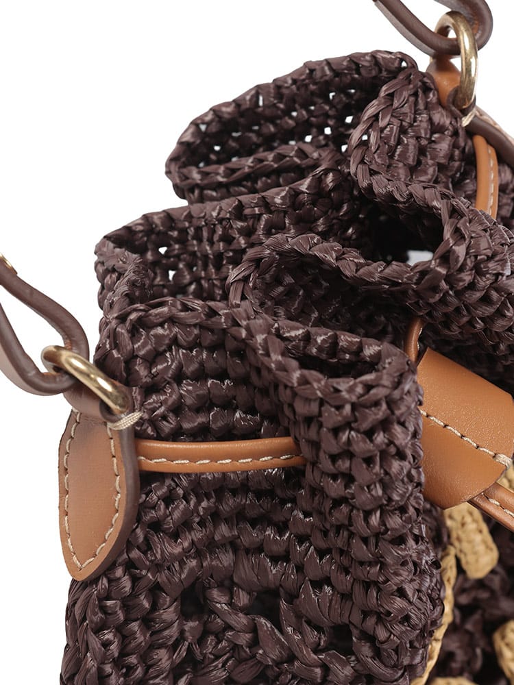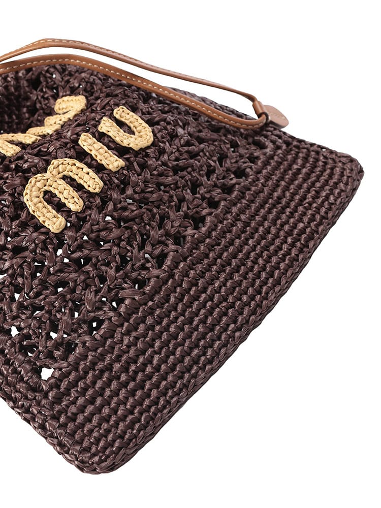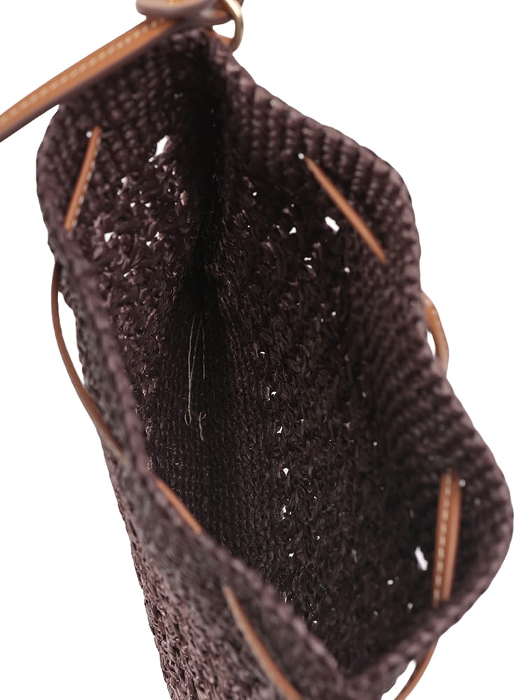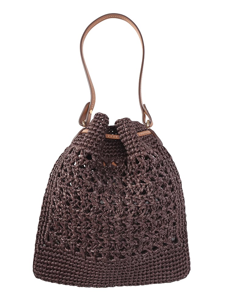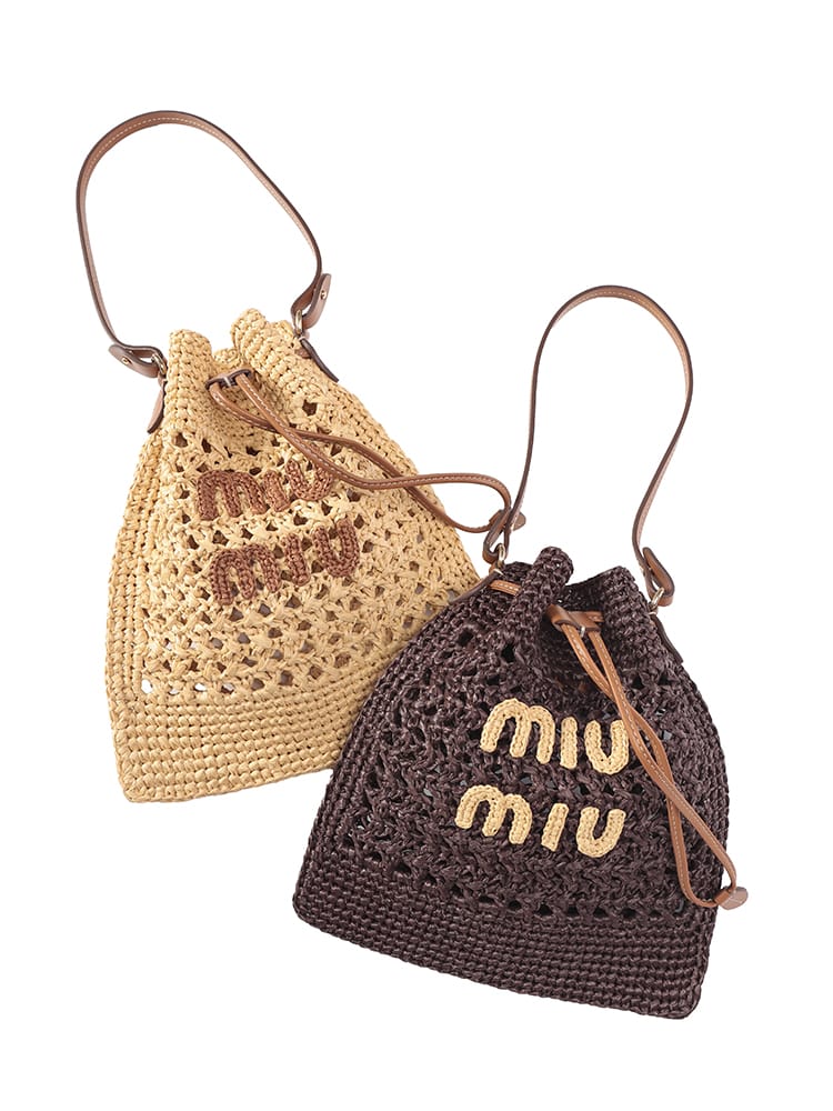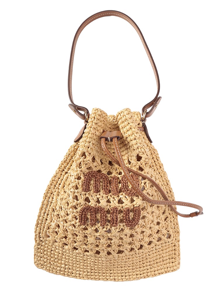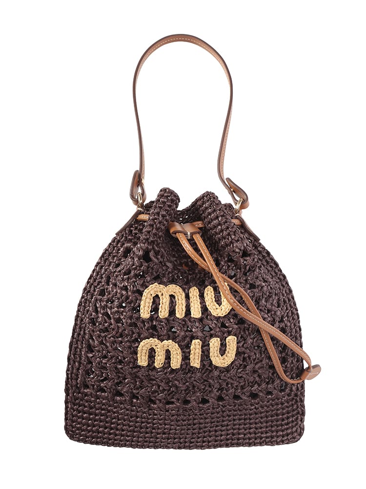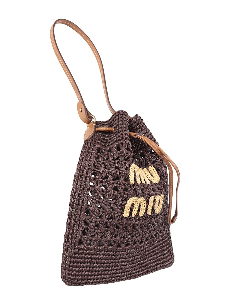 エキゾチックでエレガントなデザインのウーブンファブリックのミニバッグ。一目でわかるアイコニックなMIU MIU ロゴが存在感を放ち、レザーハンドルとドローストリングが洗練されたコントラストを演出するスタイル。