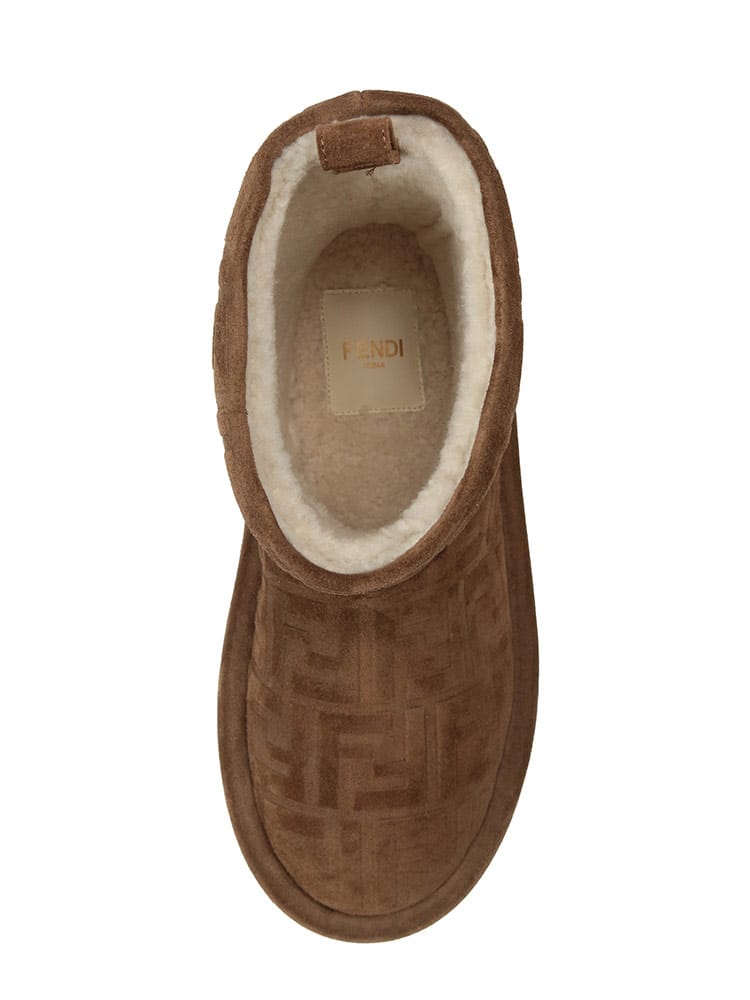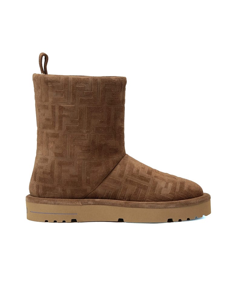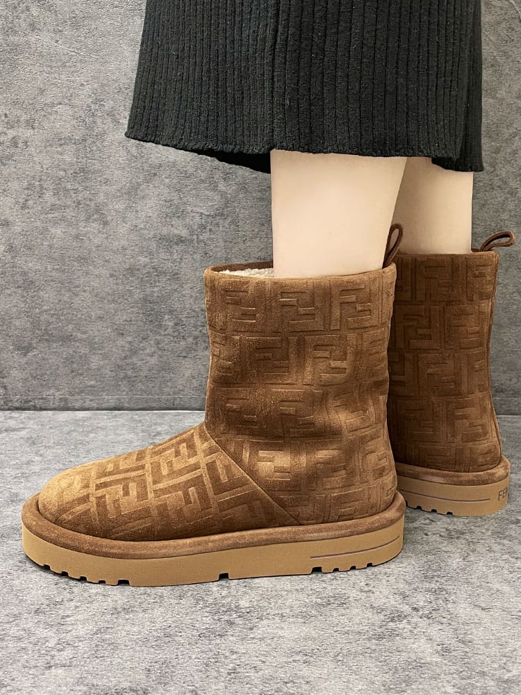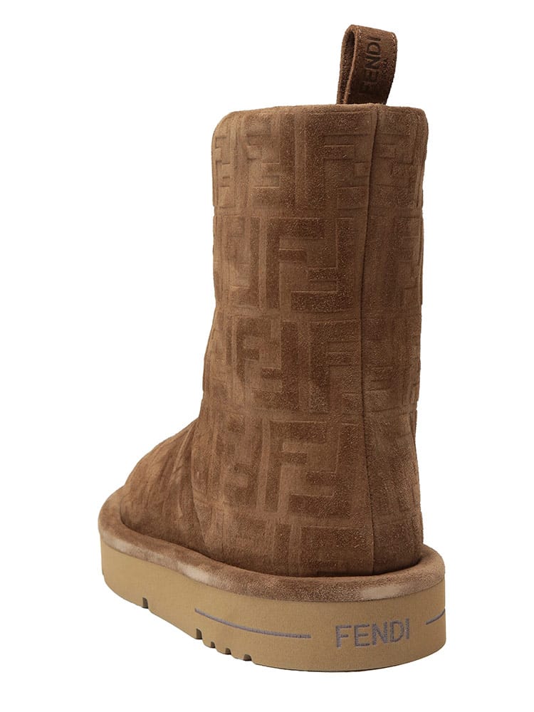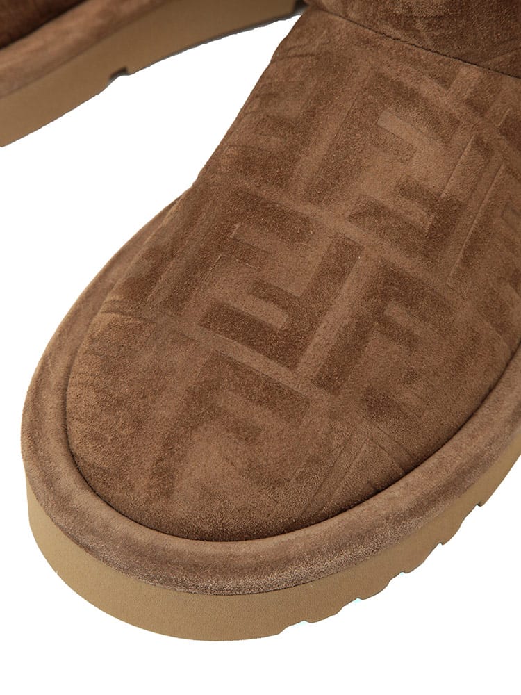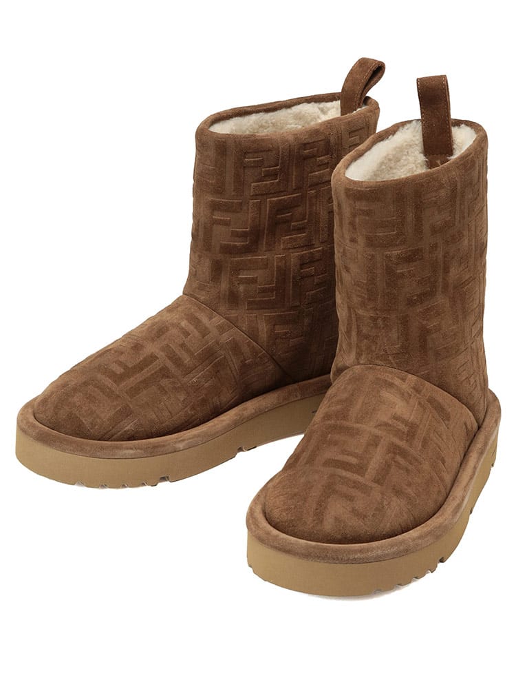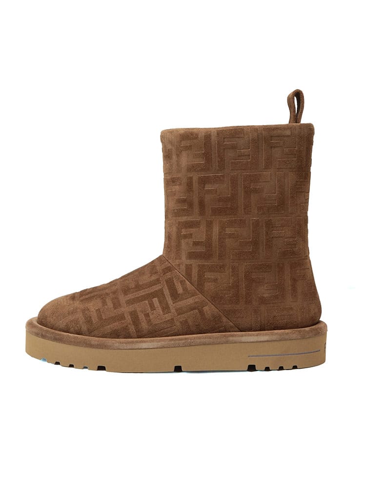 FFセームレザー ローブーツ アプレ シックです。リラックス感のあるシルエットに、フェンディらしい洗練されたデザイン。上質なスエードレザーにエンボス加工でFFロゴを施し、控えめながらもエレガントな存在感を放ちます。内側にはボア素材を使用し、足を優しく暖かく包み込みます。どんなスタイルにも合わせやすく、冬のコーディネートを格上げしてくれる一足です。