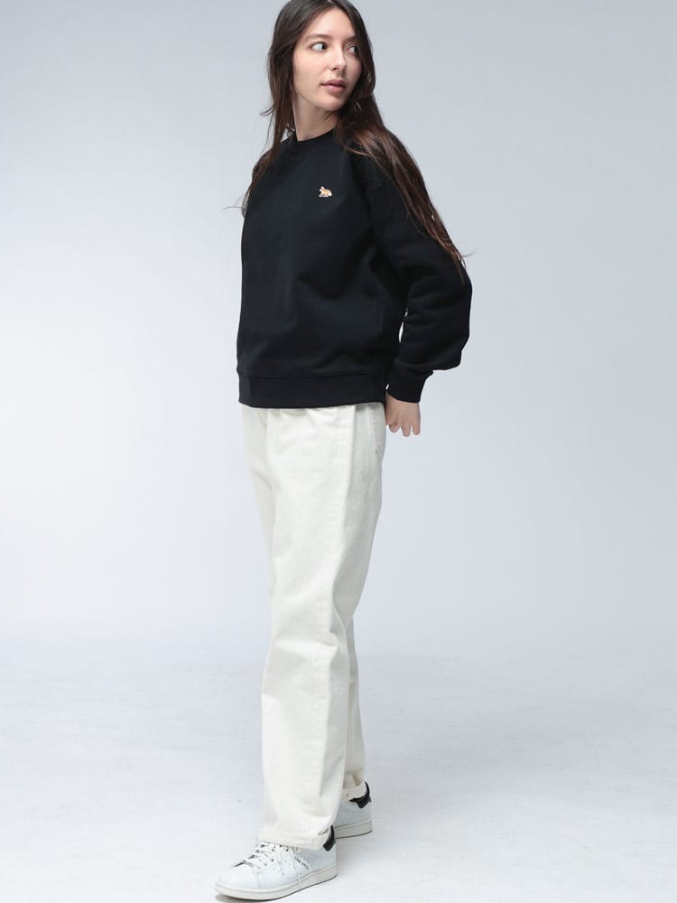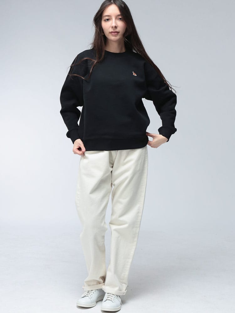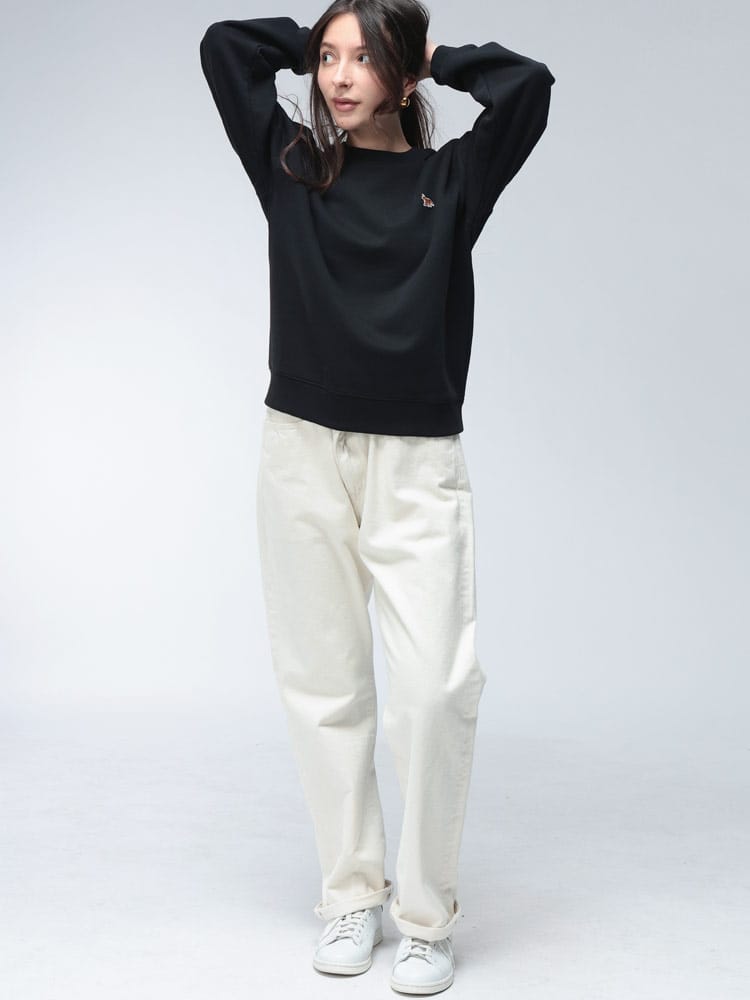 胸元の愛らしいキツネのワンポイント刺繍が目を引く、リラックス感あふれる一着です。ゆったりとしたコンフォートなシルエットと、肌触りの良い上質なコットン素材で、快適な着心地を実現しています。カジュアルながらも、フレンチシックな品の良さが漂い、デイリーコーディネートを格上げする定番アイテムです。