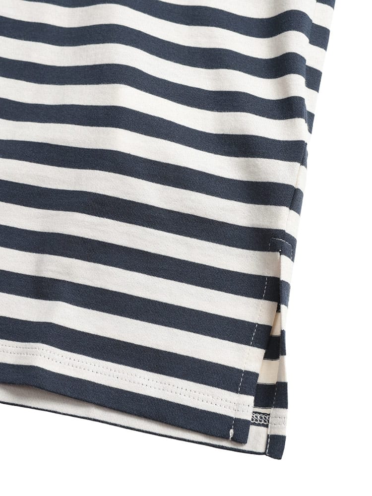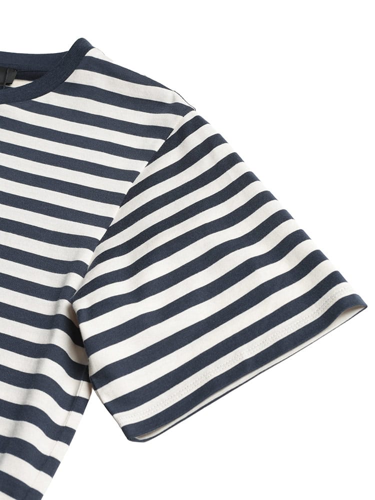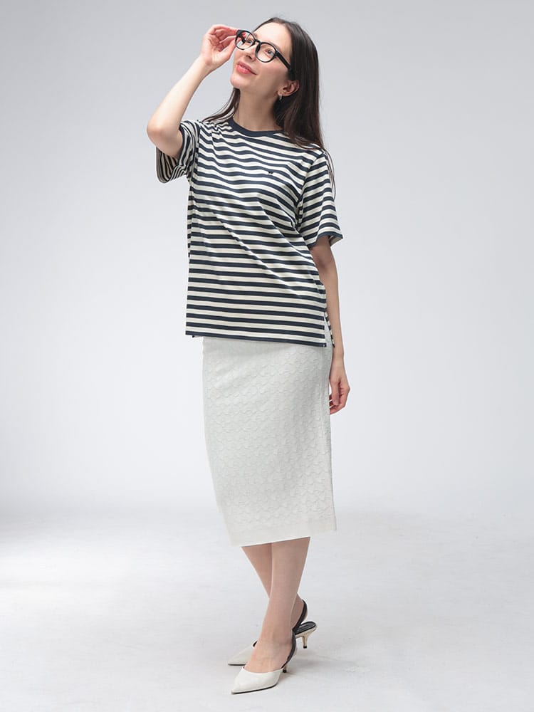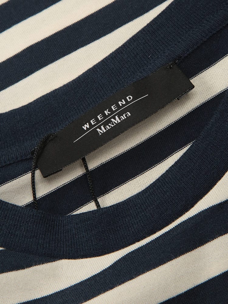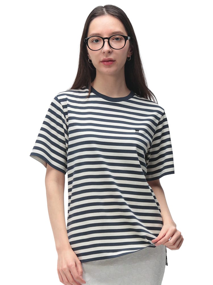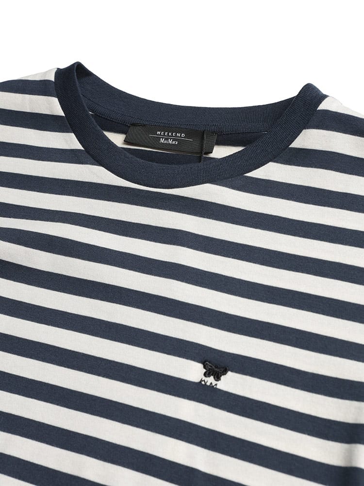 マックスマーラらしい気品漂う、洗練されたボーダー柄の半袖クルーネックTシャツ。上質なコットンの滑らかな肌触りが心地よく、カジュアルな縞柄に大人のエレガンスを添えています。胸元に配された控えめなワンポイントが、シンプルなデザインのアクセントとしてブランドのアイデンティティを主張。程よく体にフィットするシルエットは、春夏のデイリースタイルをスマートかつ軽やかに格上げしてくれる一着です。