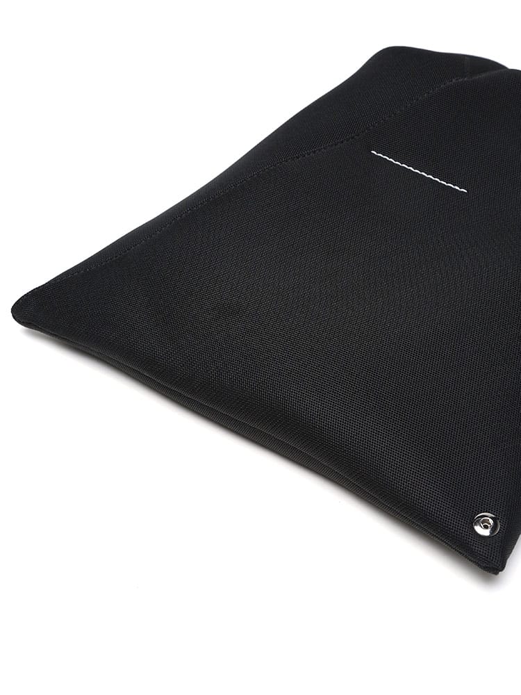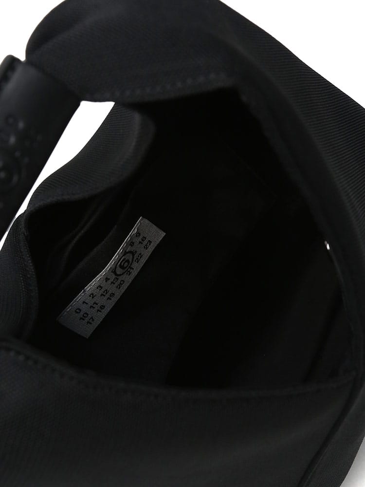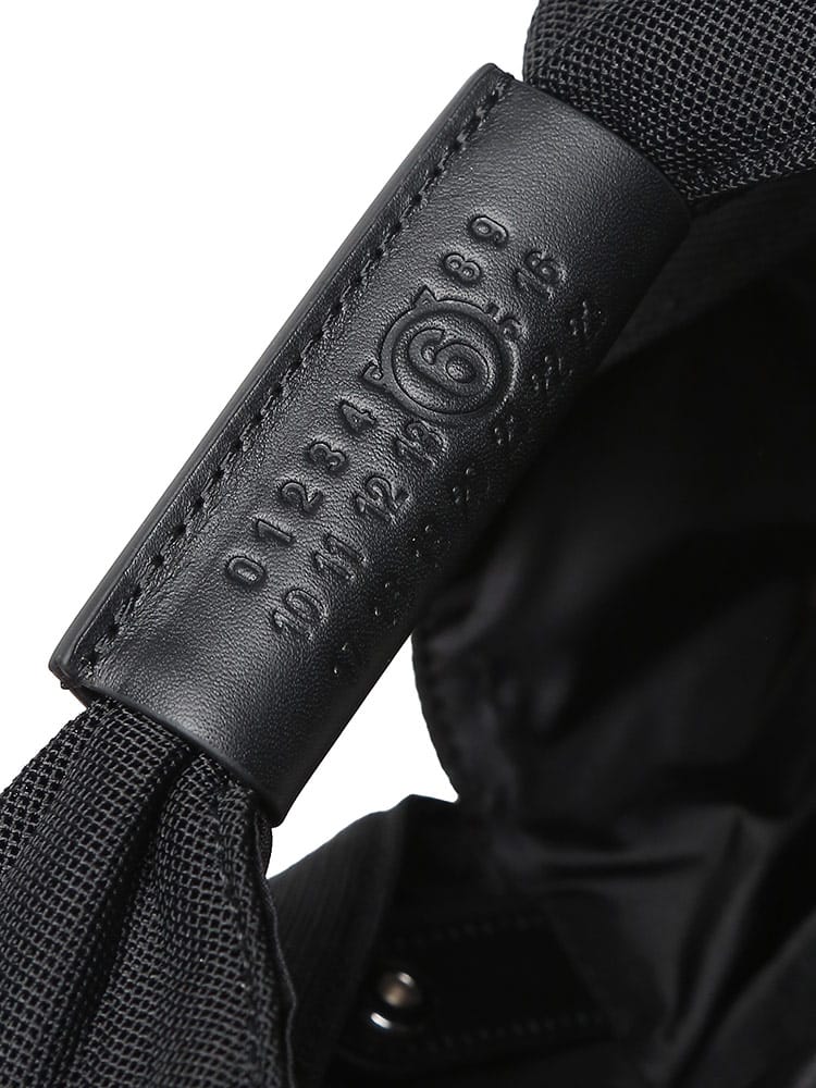 カーフレザーとメッシュを使用した、幅広のリブ編みトップハンドルが特徴的なMM6のジャパニーズバケットハンドバッグ。ピローボディスタイルで、手触りの良さが魅力です。Numericアートワークをあしらったレザーのカフとボタンクロージャーもポイント。後ろには、控えめながらはっきりとしたMM6のシグネチャー、1本の白いステッチのラインが施されています。