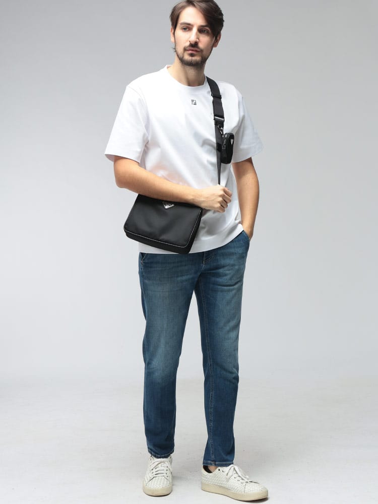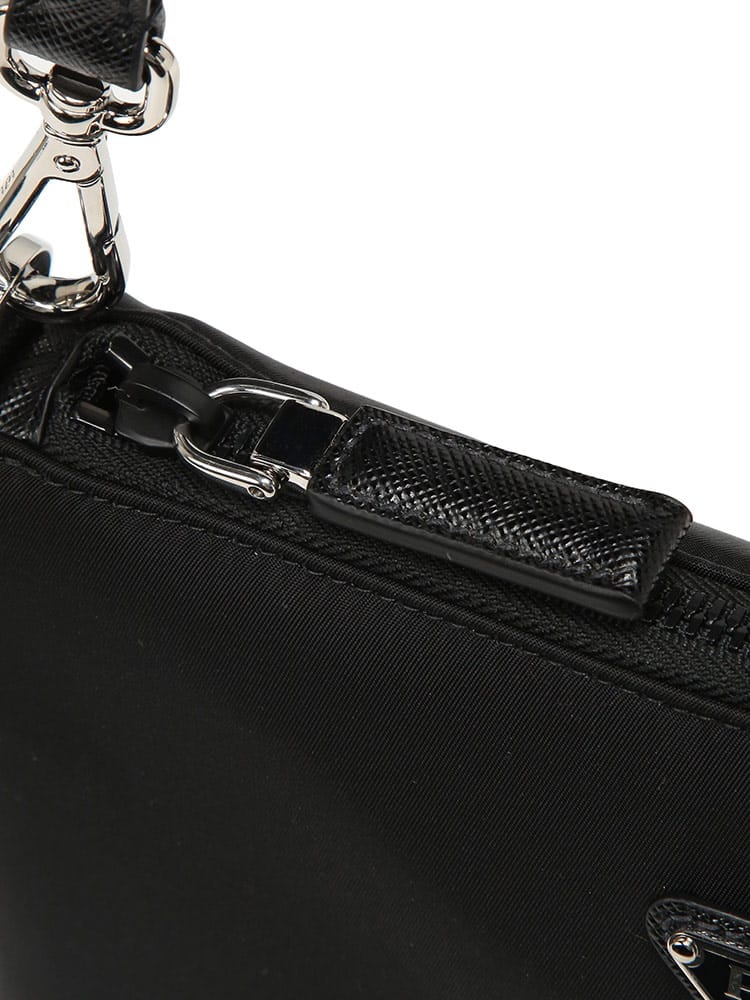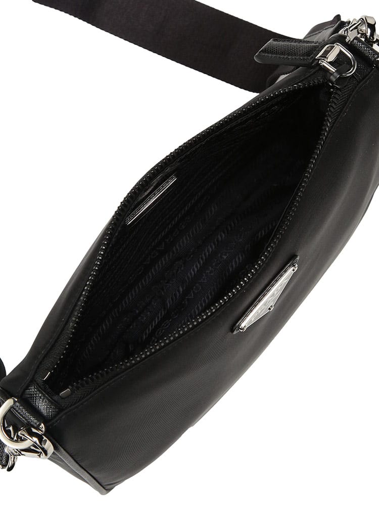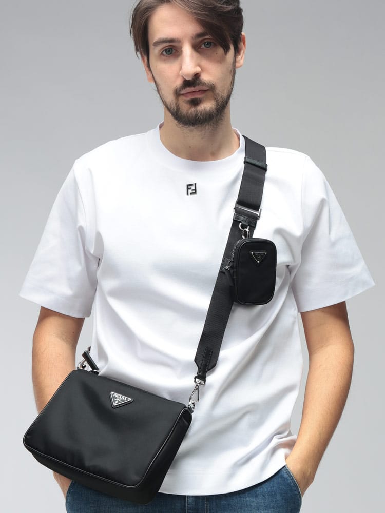 プラダの象徴的な「Re-Nylon」と、伝統的な「サフィアーノレザー」を組み合わせたモダンなショルダーバッグ。海から回収されたプラスチックを再利用した革新的な素材に、上質なレザーのディテールが気品を添えています。フロントのトライアングルロゴがアクセントとなり、コンパクトながらも圧倒的な存在感を放ちます。機能美を追求したミニマルなデザインは、都会的なスタイルを格上げする大人のための逸品です。