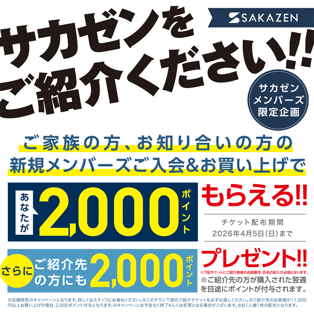 ※店舗限定のキャンペーンとなります。詳しくはスタッフにお尋ねください。※ご紹介先のお客様が11,000円以上お買い上げの場合、2,000ポイント付与させていただきます。お一人様1回限りの付与となります。