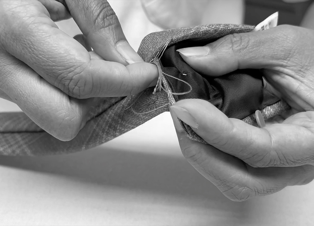 締めやすさを追求した結果、縫製が難しいウールを使用したネクタイ。職人の技が光る。