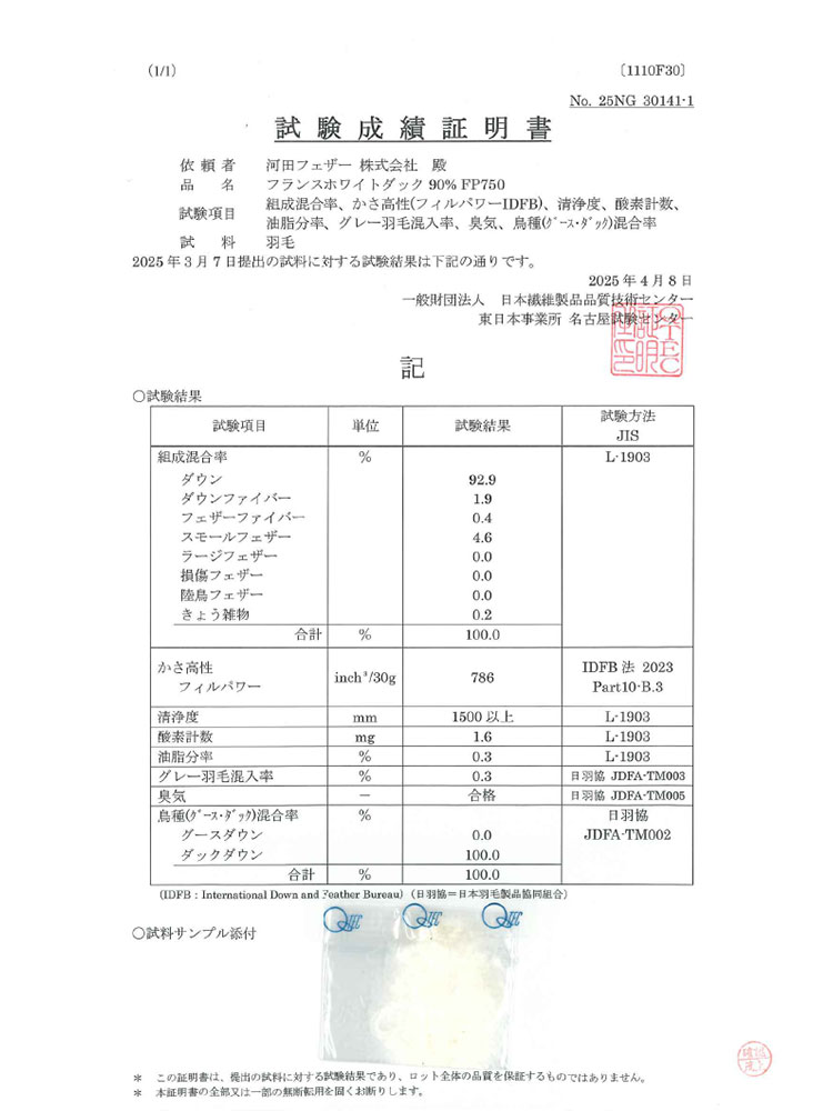 市場的に700フィルパワー以上で「高品質」とされていますが、今回使用しているダウンは750フィルパワーを証明しています。