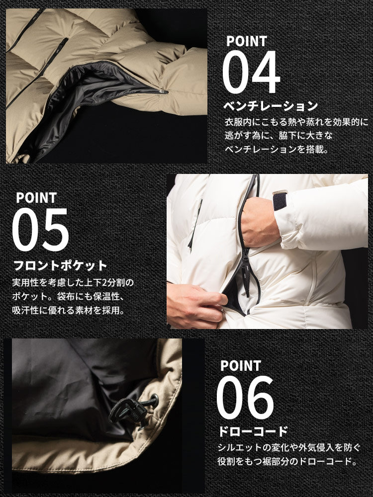 より軽く、より暖かくを目指し、高品質なダウンのみを入れる事で着用時のストレスを取り除きます。